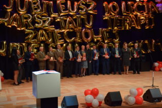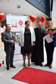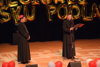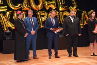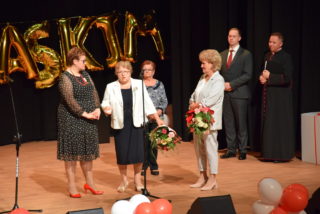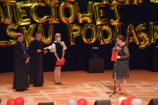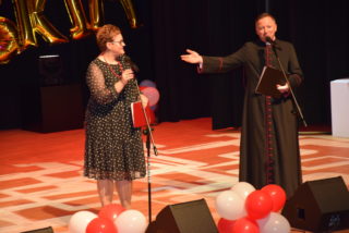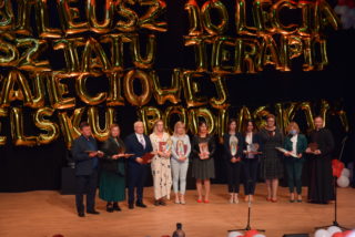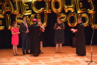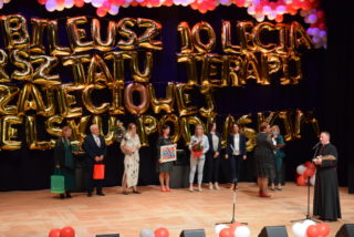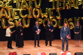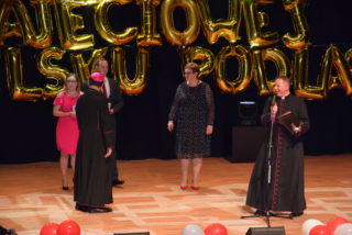 Kolejnym punktem uroczystości było wręczanie medali Benemerenti prze J.E. Ks. Bpa Piotra Sawczuka. Otrzymały je Monika Piotrowska-Śliwińska- Kierownik Warsztatu Terapii Zajęciowej w Bielsku Podlaskim oraz Monika Siecińska-Jaworowska- Prezes zarządu firmy Suempol Sp. z o.o. w Bielsku Podlaskim. Statuetki i podziękowania popłynęły dla wszystkich przedstawicieli samorządu, służb oraz sponsorów. Wyjątkowa statuetka została wręczona ks. kan. Krzysztofowi Kisielewiczowi, który jako ówczesny dyrektor był inicjatorem założenia Warsztatu Terapii Zajęciowej w Bielsku Podlaskim. Natomiast szczególne podziękowania przekazał ks. bp Piotr Sawczuk dla Zarządu Województwa Podlaskiego, Zarządu Powiatu Bielskiego oraz Dyrekcji PFRON w postaci dyplomu uznania. Zgromadzeni goście podczas Jubileuszu przekazywali liczne prezenty oraz grawertony. Firma Suempol podarowała liczne sprzęty gospodarstwa domowego, które znajdą swoje zastosowanie w Pracowni Gospodarstwa Domowego. Zarząd Banku Spółdzielczego w Brańsku przekazał na ręce Pani kierownik czek na kwotę 2 tys. zł. Ponadto upominki w formie koszów słodkości, bukietów kwiatowych oraz innych darów przyjaźni przekazała Dyrekcja zaprzyjaźnionych Warsztatów Terapii Zajęciowej z: Hajnówki, Nowej Woli, Siemiatycz, Sokołowa Podlaskiego, Archidiecezji Białostockiej, Szumowa, Moniek, Środowiskowego Domu Samopomocy w Bielsku Podlaskim, Zespołu Szkół Specjalnych im. Jana Pawła II w Bielsku Podlaskim oraz Domu Pomocy Społecznej im. Jana Pawła II w Brańsku. Ponadto serdeczności wraz z upominkami popłynęły od Dyrekcji Placówek Szkolnych z Miasta Bielsk Podlaski oraz Uniwersytetu III Wieku. Na zakończenie Dyrektor Caritas – ks. kan. dr Łukasz Gołębiewski zaprosił wszystkich pracowników, kapelana i alumna na scenę, by tam wręczyć upominki z okazji Jubileuszu.