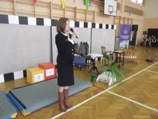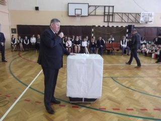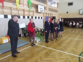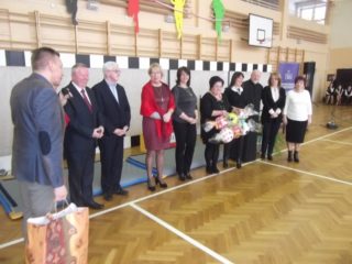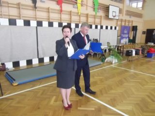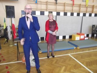 Następnie przyszedł czas na nagrody w konkursie plastycznym „Ja i sport” które wręczali burmistrz Bogusław Karakula – również absolwent tej szkoły – i dyrektor szkoły Zofia Steć. Organizatorką konkursu była Małgorzata Malinowska.