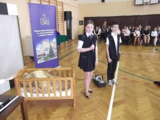 Po części oficjalnej przyszedł czas na część artystyczną. Tu przybyli goście mogli obejrzeć wzruszającą inscenizację teatralno-muzyczną przygotowaną przez młodzież pod opieką nauczycieli: Agnieszki Rejowskiej, Zbigniewa Filiksa, Joanny Wasiluk i Anny Dróżdż. Program ukazał kolejne etapy życia Patrona od czasów szkolnych poprzez działalność sportową aż do tragicznej śmierci i pochowania w Palmirach.