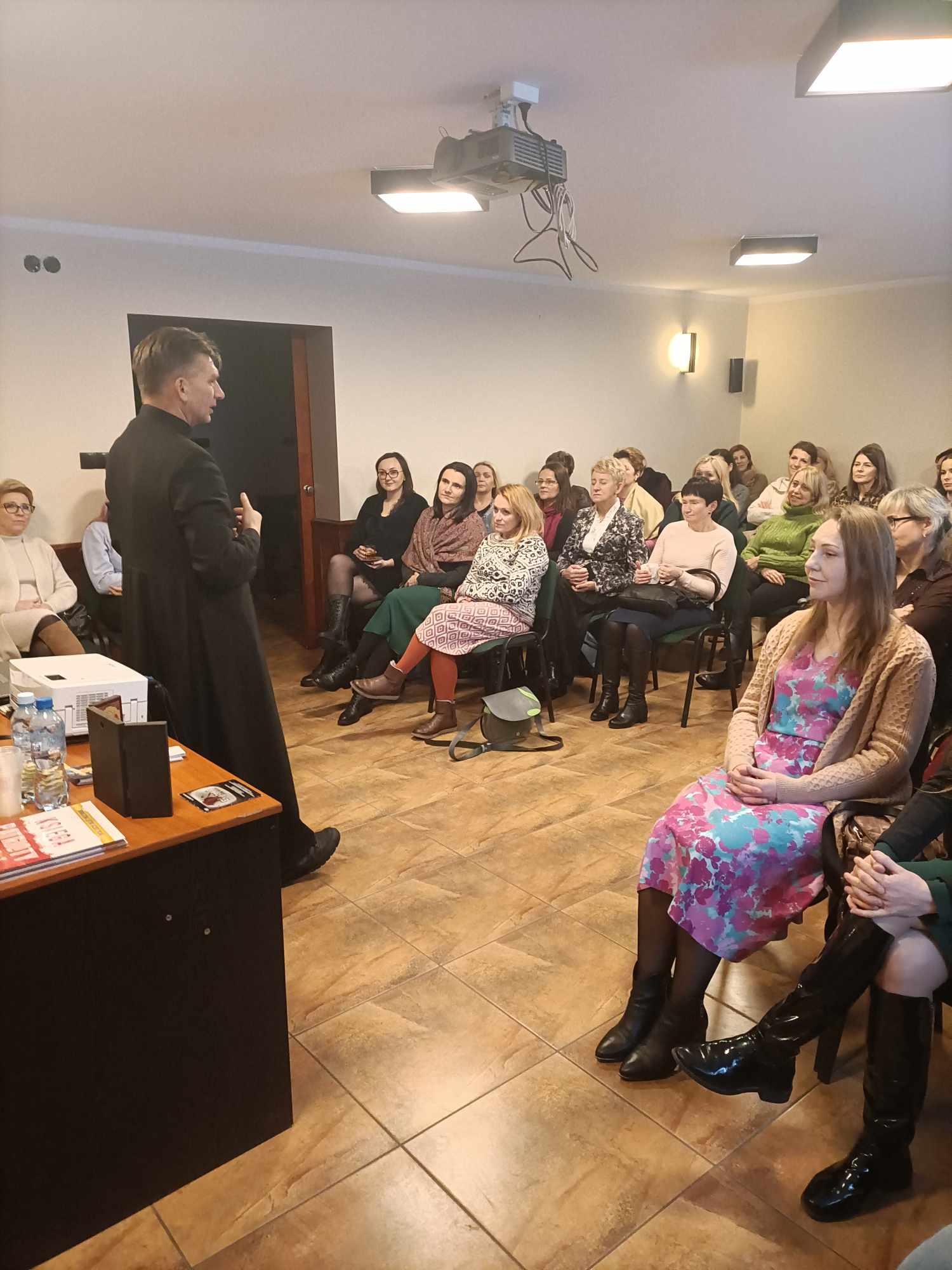 Dalsze niewieście czuwanie odbyło się w świetlicy parafialnej. Pierwszą prelegentką była Ewa Gabrysiak, akredytowana do prowadzenia grupy warsztatowej 12 Kroków Ku Pełni Życia. Ukazując nam naturę kobiety w zamyśle Stwórcy, na podstawie Pisma Świętego zachęcała do starań bycia piękną w relacjach. Zachęcała do pracy nad sobą, by stawać się lepszą dla siebie i innych. Następnie diecezjalny duszpasterz kobiet wygłosił konferencję o pozycji kobiety w okresie mędrców Izraela, powołując się Księgę Syracydesa. Zaznaczył jak ważne jest miejsce i powołanie kobiety w życiu mężczyzny i społeczeństwa. Albowiem dzielna niewiasta jest uosobieniem mądrości Bożej i szczęśliwy ten, kto ją znajdzie.