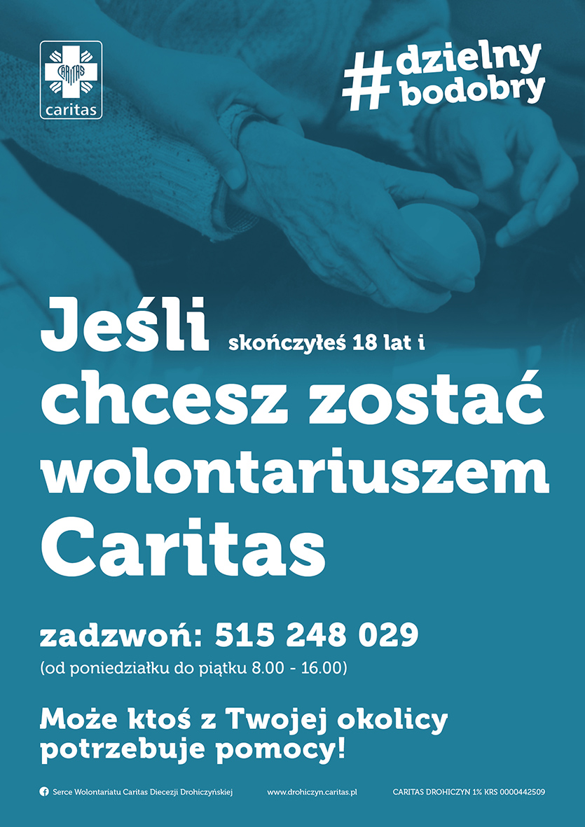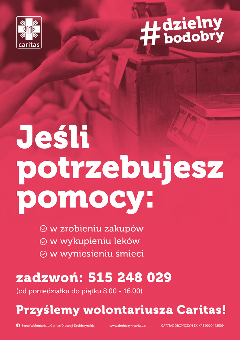 Caritas Diecezji Drohiczyńskiej w tej trudnej sytuacji zagrożenia epidemiologicznego, zachęca do objęcia pomocą osoby starsze, chore, niepełnosprawne, nieporadne, samotnie wychowujące dzieci, mieszkające na terenie Diecezji Drohiczyńskiej, którzy narażeni są szczególnie na zarażenie wirusem oraz jego skutkami. Dlatego prosimy o wspólną solidarność w tych trudnych czasach i włączenie się w akcję #dzielnybodobry