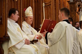Ks. Biskup przypomniał słowa z modlitwy konsekracyjnej, które wraz z gestem nałożenia rąk stanowią istotę udzielanych święceń oraz moment przekazania księgi Pisma Świętego i misję głoszenia słowa Bożego.