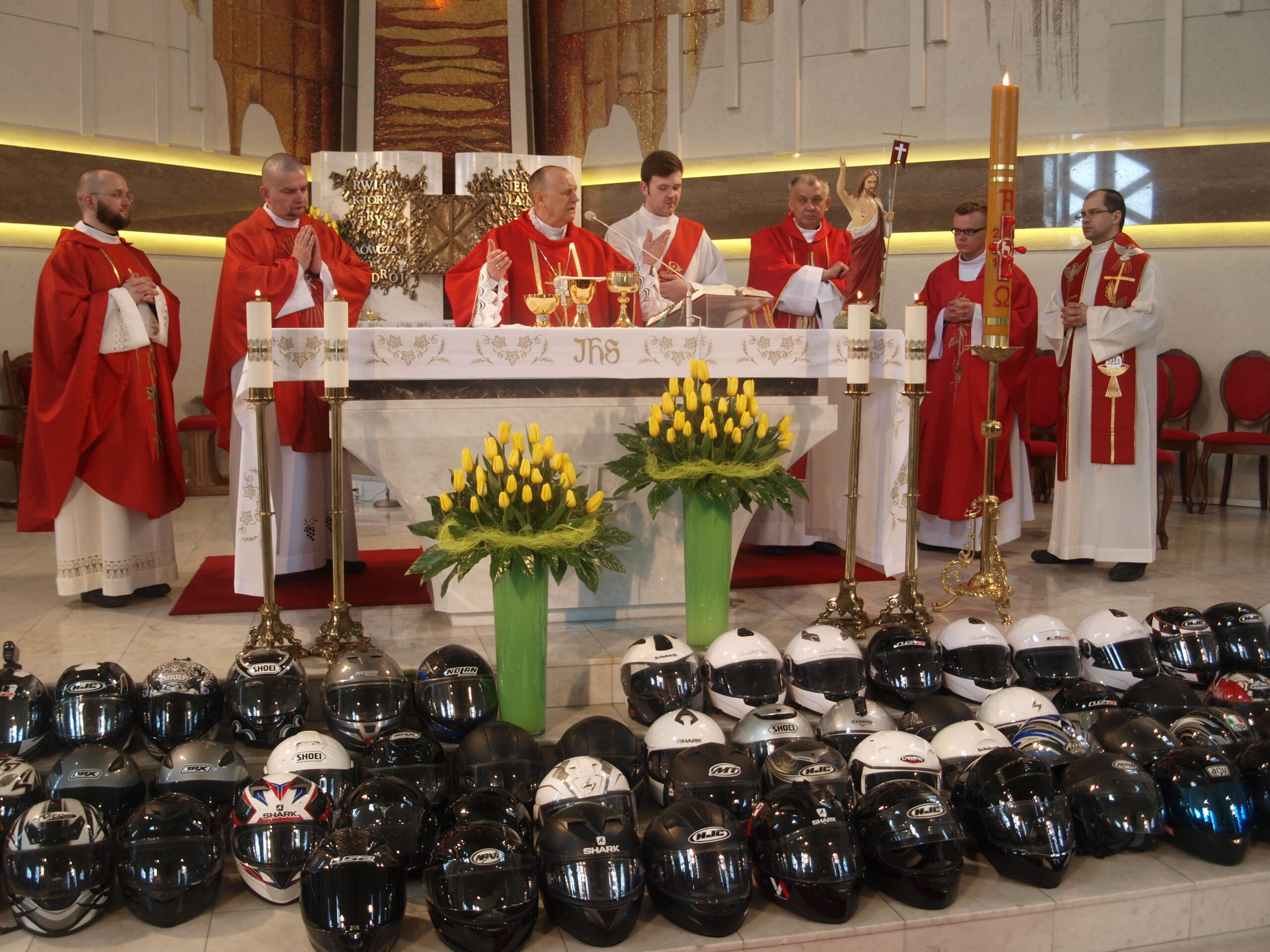 W intencji motocyklistów Mszę w. z pasterzem diecezji koncelebrowali ks. Janusz Szymański – kapelan motocyklistów, ks. prał. Zbigniew Niemyjski, ks. Dariusz Kucharek, ks. Wojciech Piotrowski, ks. Arkadiusz Tymoszuk
