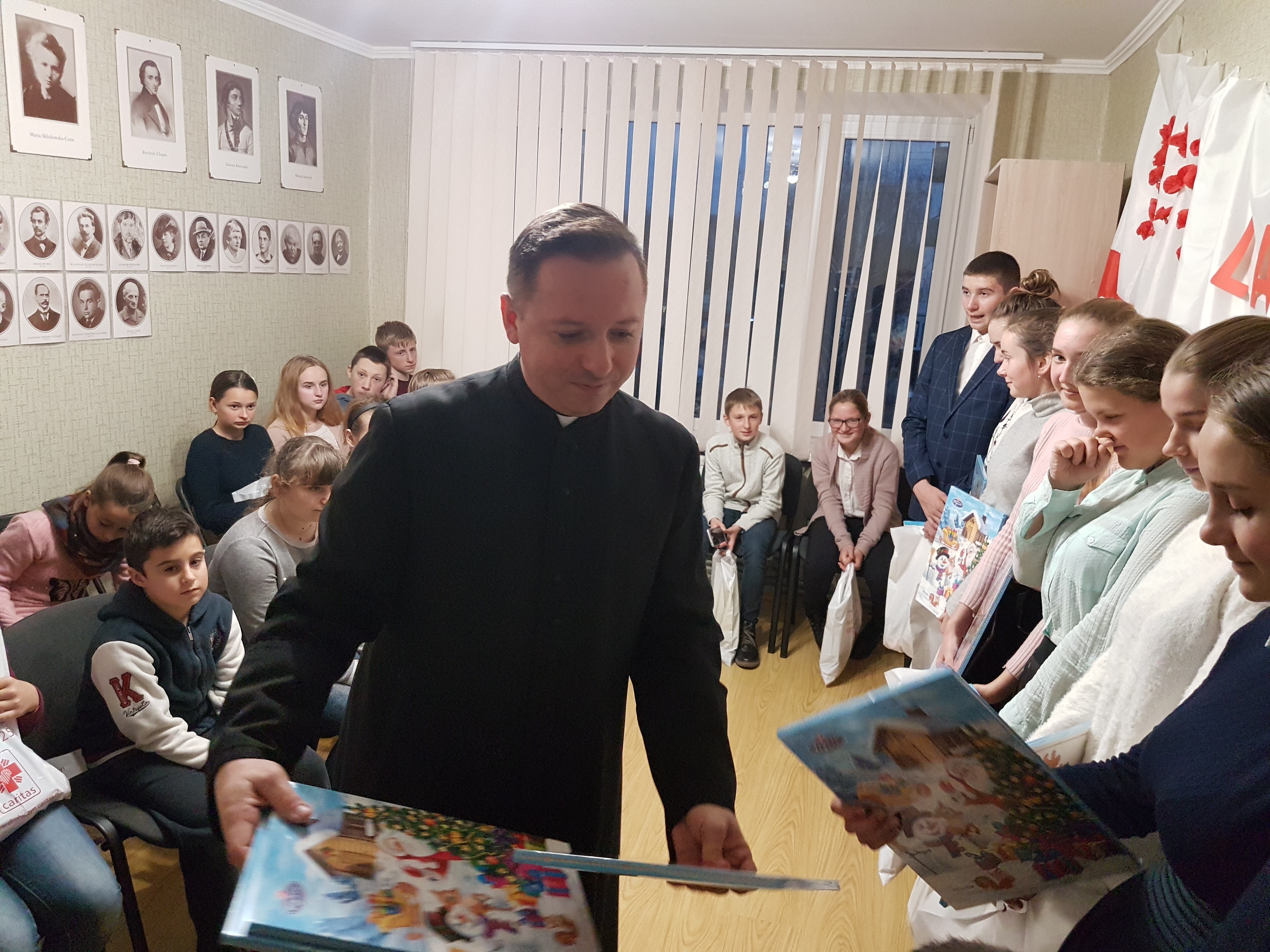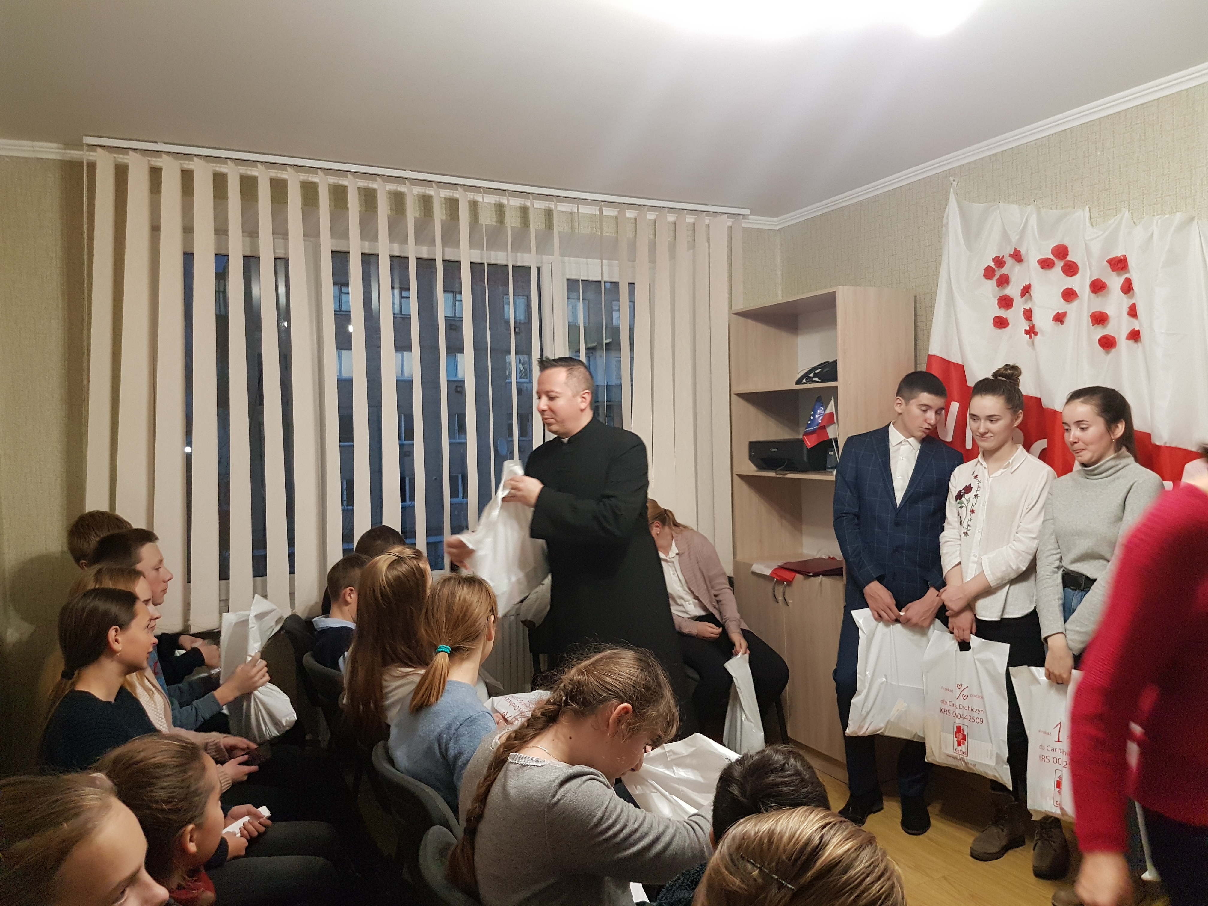 Wokół tego domu skupieni są Polacy, którzy z daleka od Ojczyzny, bardzo często żyją w ciężkich warunkach i znikąd nie mają pomocy. Dzieci z tej wspólnoty korzystają z nauki języka polskiego, które prowadzi Honorata Mięsak – nauczycielka z Drohiczyna, od lat związana z pomocą Polakom na Wschodzie. Poświęcając swój czas wychowuje i zaszczepia w najmłodszych miłość do Boga i Polski. Wizyta była doskonałą okazją, aby uczcić 100-lecie odzyskania przez Polską niepodległości. Dzieci pod kierunkiem Pani Honoraty przygotowały przepiękne wiersze, teksty i pieśni patriotyczne. Wzruszające było ogromne zaangażowanie dzieci w jak najpiękniejsze przedstawienie programu artystycznego. Łzy radości i duma towarzyszyły wspólnemu odśpiewaniu Hymnu polskiego na ukraińskiej ziemi w polskiej szkole.