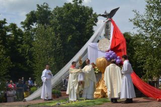 Przy drugim ołtarzu, niezwykle pięknym symbolicznie usytuowanym przy Pomniku Niepodległości Polski, miejscu upamiętniającym zrywy niepodległościowe, walkę o polskość, wizytę w Ojczyźnie i Drohiczynie Ojca św. Jana Pawła II, ewangelię zaśpiewał ks. prałat Zbigniew Karolak, proboszcz Parafii Najświętszej Opatrzności Bożej, a przy ołtarzu przy miejskim ratuszu ks. Łukasz Grabowski, wikariusz Parafii Miłosierdzia Bożego.