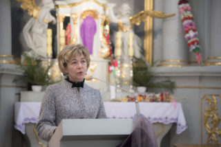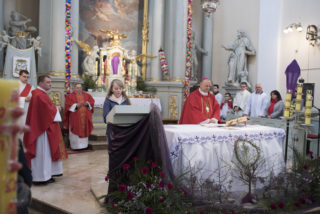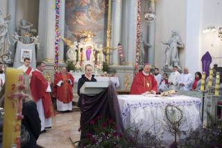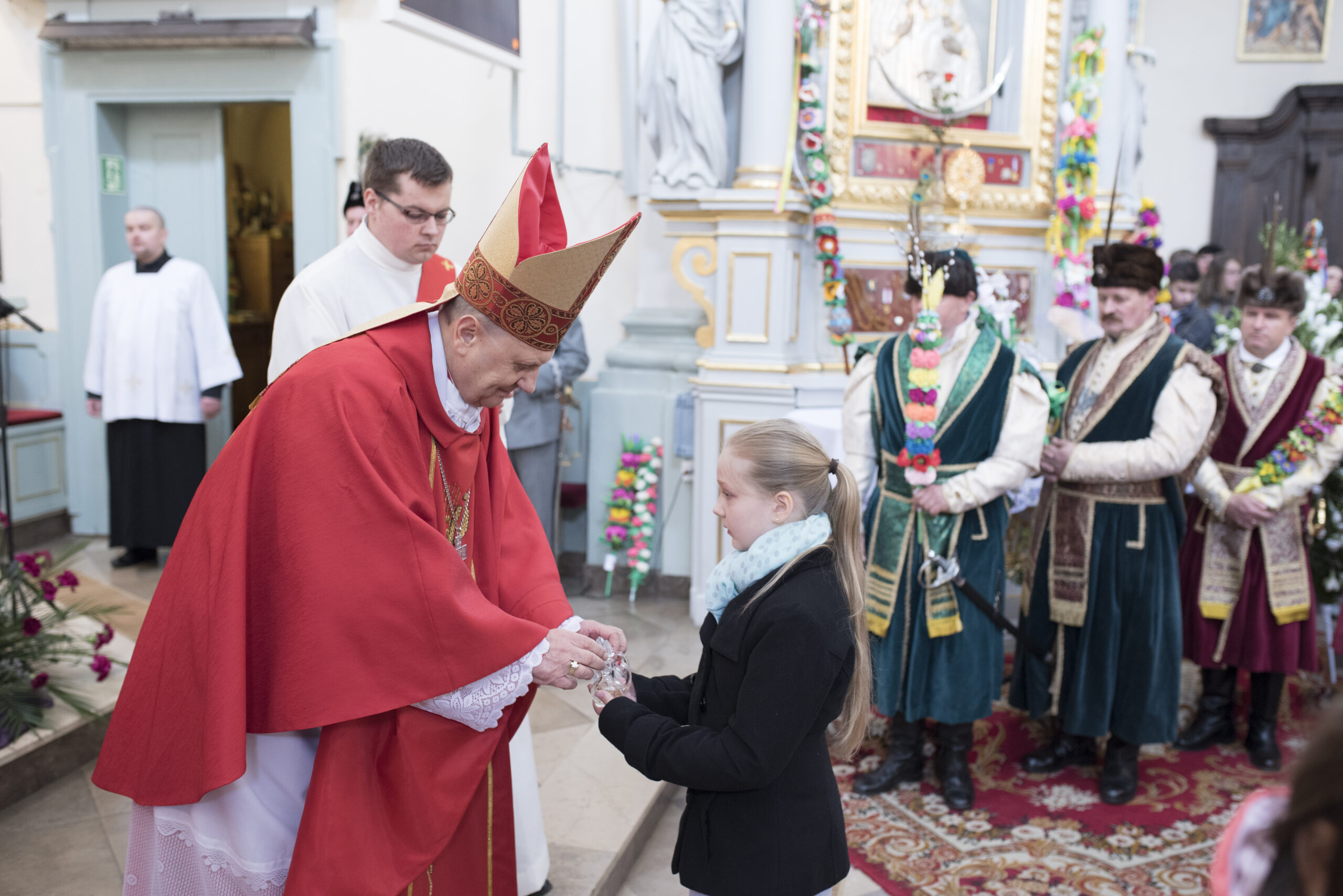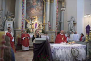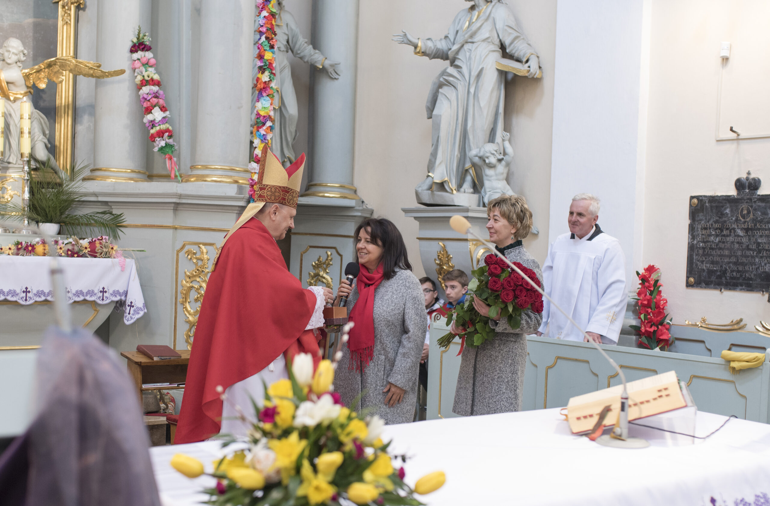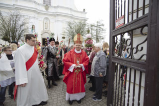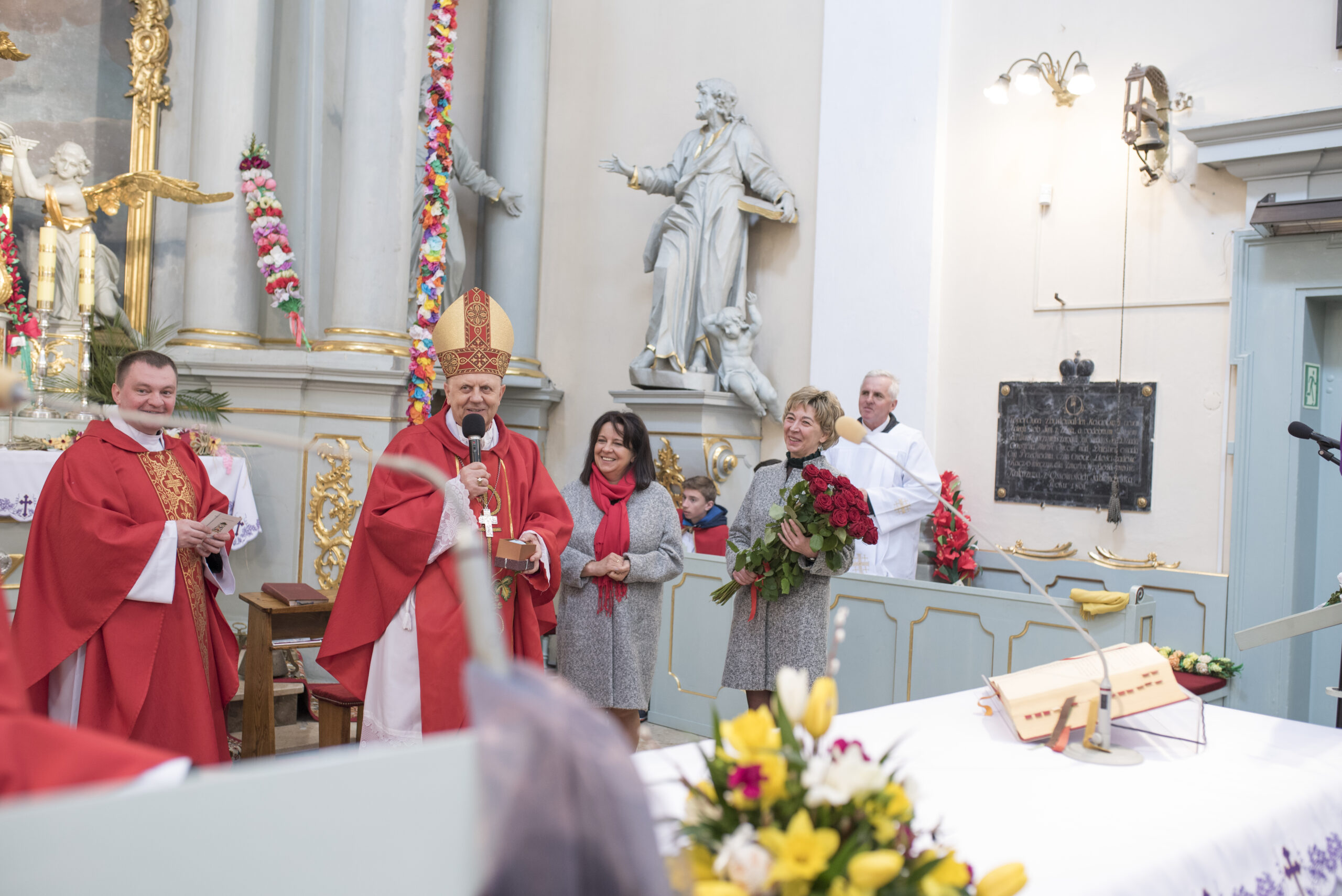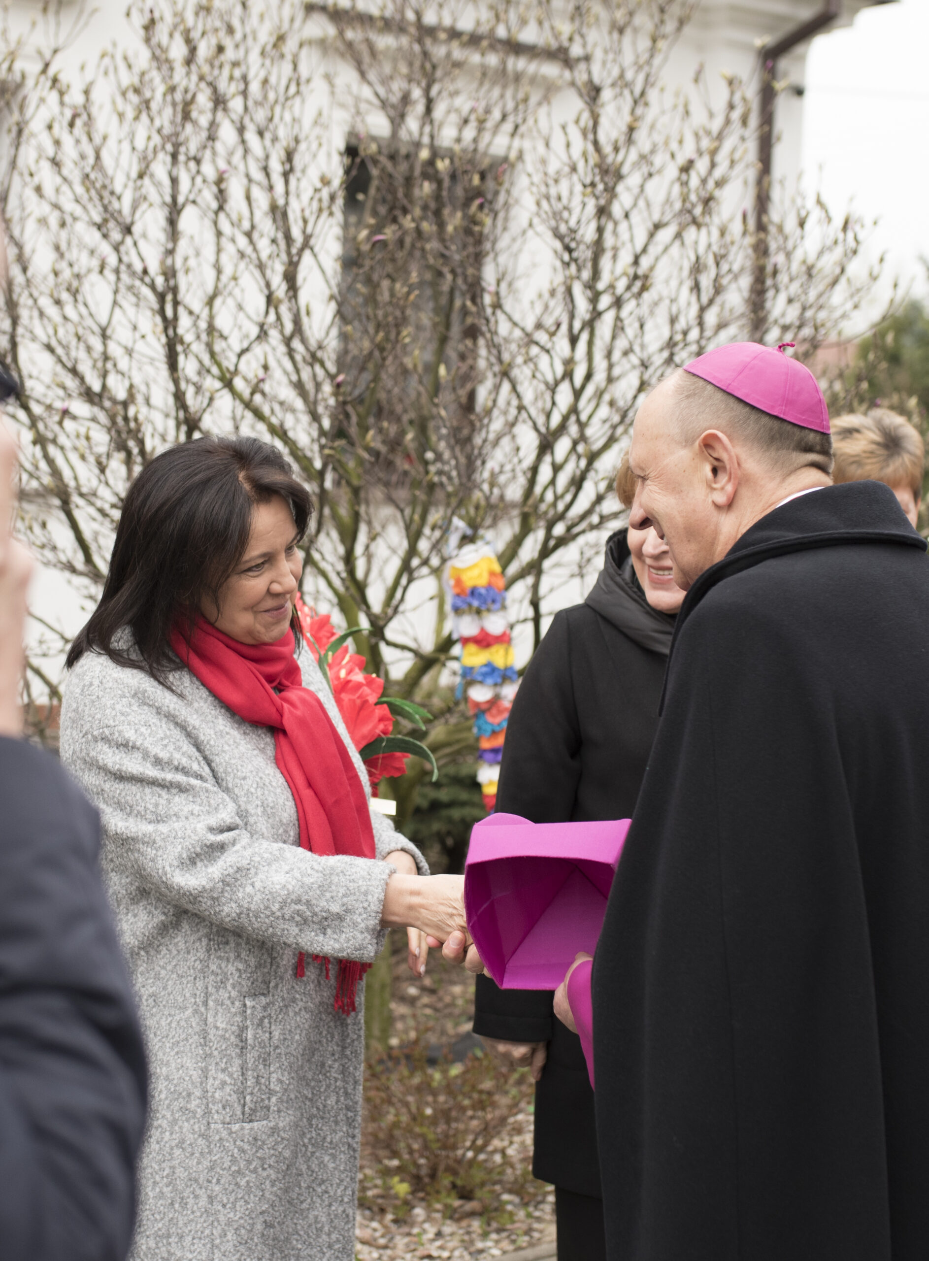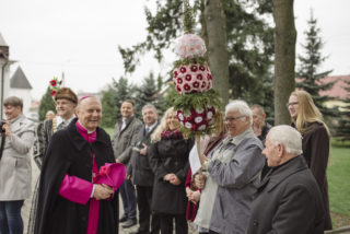 Na zakończenie Mszy Świętej Dyrektor Muzeum Rolnictwa Dorota Łapiak oraz Zastępca Dyrektora Anna Wiśniewska dziękując za wieloletni Patronat Duchowy nad Konkursem złożyły na ręce Księdza Biskupa Tadeusza Pikusa pisankę z panoramą Drohiczyna wykonaną przez Pana Wojciecha Boguckiego.