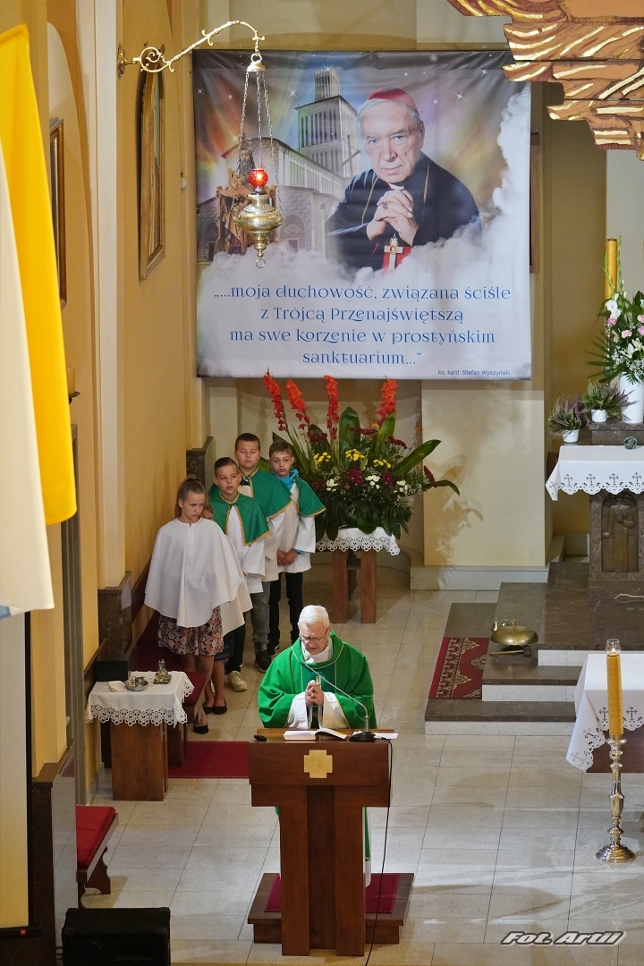 W bazylice prostyńskiej w dniu beatyfikacji Kardynała Stefana Wyszyńskiego, 12 września, podczas Mszy Św. o godz. 9.00 obecne były poczty sztandarowe Szkoły Podstawowej im. Kardynała Stefana Wyszyńskiego w Kiełczewie wraz z dyr. Andrzejem Korosiem i Szkoły Podstawowej im. Jana Pawła II w Prostyni, z dyr. Ewą Szymanik oraz harcerze 14. Drużyny Harcerskiej „Sokoły” wraz z phm Ewą Roguską, którzy trzymali wartę honorową przy obrazie Kardynała Stefana Wyszyńskiego, nauczyciele, uczniowie, parafianie i pielgrzymi licznie nawiedzający Sanktuarium. Zaraz po Mszy św. odbyło się przedstawienie pod tytułem „Czas to Miłość” przygotowane przez parafian prostyńskich pod kierunkiem p. Doroty Koroś i p. Agnieszki Steć. Był to montaż słowno-muzyczny składający się z krótkich filmów ukazujących Zuzelę, Andrzejewo oraz inne miejsca związane z Prymasem Tysiąclecia. Przy stoliku siedział Kardynał i opisywał swoje życie: opowiadał o matce, którą stracił mając 9 lat i o Matce Bożej, która w wizerunkach częstochowskim i ostrobramskim towarzyszyła Mu w dalszym życiu kapłańskim. Pojawiły się także kobiety ubrane w czerń poszukujące sensu życia i nauczyciela, który wskazałby właściwą drogę. Podczas wspominania przez Kardynała trudnych lat komunizmu, podeszło do Niego dwóch funkcjonariuszy, którzy, wspominając rok 1953, aresztowali Prymasa i uwięzili. Przedstawienie zakończyło się odejściem Kardynała w poczuciu wypełnionej misji, w opinii świętości. Inscenizacji towarzyszyły pieśni: „Jest na świecie miłość”, „Jedynemu Bogu przez Maryję”, „O, niezłomny Prymasie Tysiąclecia”, „Jest takie miejsce” i hymn „Soli Deo” w wykonaniu chóru parafialnego i dzieci pod kierunkiem pp Ewy i Wojciecha Jakubików. Wszystkim występującym i organizatorom podziękował ks. kan. Józef Poskrobko, proboszcz Parafii Prostyń, a wierni, zgromadzeni w bazylice, nagrodzili ich brawami.