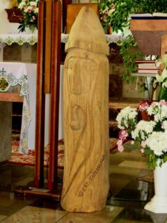 Dziękujemy za ten piękny plac wokół świątyni, pełen kwiatów i zieleni, odnowione kamienne stacje drogi krzyżowej i figurę świętego Andrzeja Boboli w miejscu starego kościoła, który uświetnia teraz Ziołowy Zakątek.