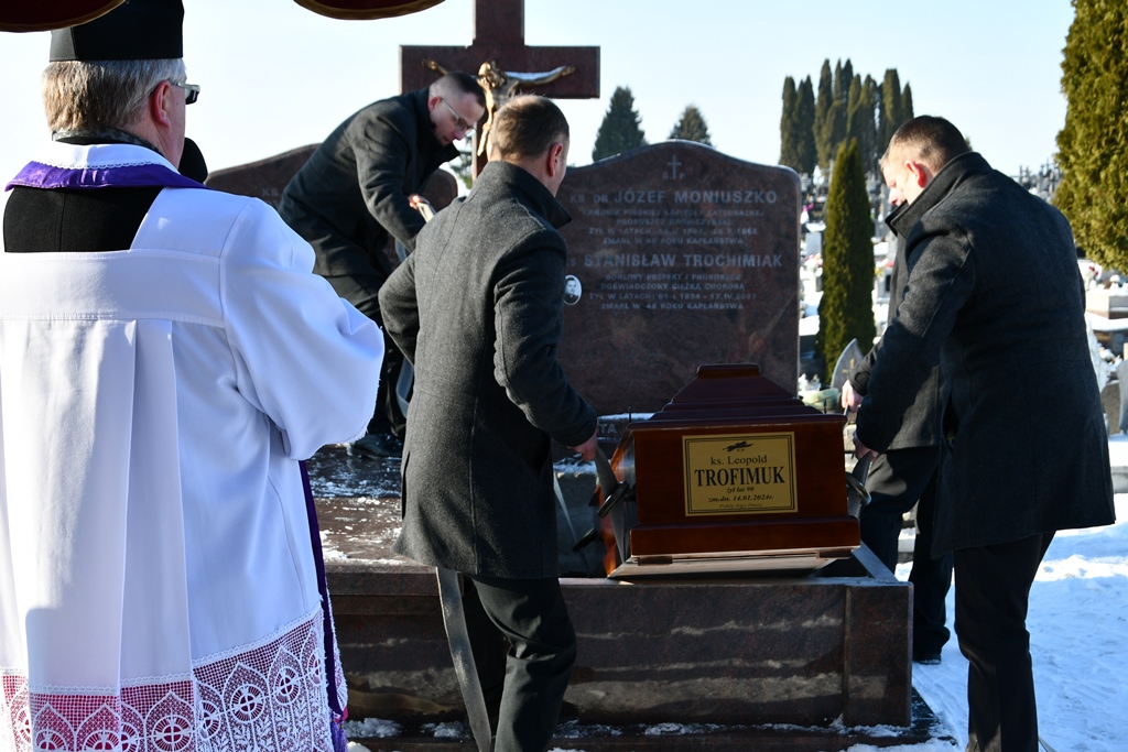 Homilię wygłosił bp Piotr Sawczuk. Przypomniał najważniejsze wydarzenia z życia śp. ks. Trofimuka. Zwrócił uwaga na bardzo trudne czasy, kiedy to młody Leopold, odpowiadając na Boże wezwanie, wstąpił na kapłańską drogę. „Jako kapłan prze ponad 60 lat budził w ludzkich sercach nadzieję i otwierał je na Bożą miłość. To wymagało wielkiego trudu, bo czasem nadzieja w człowieku słabnie i trzeba ją na nowo rozniecić. Na tym polega duszpasterzowanie” – powiedział biskup. Jak zauważył  śp. ks. Leopold odbywał dalekie podróże, był pasjonatem literatury z różnych dziedzin, miał w sobie niezwykłą ciekawość świata. „Dziś już nie musi szukać wiedzy w książkach – poznał prawdę i na pewno czuje się mile zaskoczony. Bóg jest piękniejszy niż opisy na Jego temat; jaśniejszy niż świadectwa uduchowionych mistyków naznaczone jednak cieniem ludzkiej niedoskonałości” – kontynuował biskup. Dożył słusznego wieku, zachowując do końca, pomimo cierpienia, pogodę ducha i trzeźwość umysłu. Biskup podziękował również wszystkim osobom, które szczególnie w ostatnim czasie opiekowały się śp. ks. Leopoldem. „Niech Chrystus, najwyższy i Wieczny Pasterz przyjmie wiernego sługę do siebie i nagrodzi jego wiarę i miłość, jego pokorę i pasję, jego długie i wytrwałe odkrywanie swojej drogi, a jednocześnie poprzestawanie na rzeczach małych i pogodę ducha, która jest oznaką czystego sumienia i bliskości Boga” – podsumował.