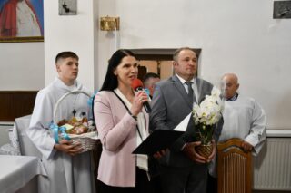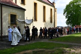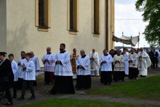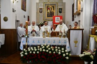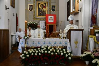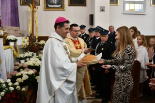Splendoru całej uroczystości dodał fakt, że parafia ta w tym roku obchodzi 75. rocznicę swojego istnienia. Przybyłych gości powitał miejscowy proboszcz ks. Jarosław Wojasiński. W wygłoszonej homilii biskup przypomniał historię parafii przywołując postaci kolejnych duszpasterzy pełniących urząd proboszcza. Nakreślił również kontekst w jakim była budowana parafialna świątynia, podkreślając niełatwy czas, jaki panował w 1950 r. „Wasi przodkowie nie bali się zaufać Bogu, nie bali się związać z Kościołem, chodzić na Mszę św., nie bali się mieć planów na przyszłość, myśleć o budowie własnej świątyni. Wierzyli w skuteczność wstawiennictwa Najświętszej Maryi Panny Królowej Polski” – powiedział. Odniósł się również do obchodzonej tego dnia kolejnej rocznicy uchwalenia Konstytucji 3 Maja. Podkreślił dziejowy związek między Kościołem a Ojczyną. „Droga Kościoła i droga narodu w Polsce są ze sobą ścisłe splecione. Nawet dzisiejsza uroczystość to potwierdza, bo obchodzimy święto państwowe i jednocześnie uroczystość kościelną. Uczniowie Chrystusa mają prawdę Ewangelii i mają Ducha Świętego, który wszystko im wyjaśnia, który ich broni i uświęca. Muszą więc wiedzieć, że ich misją jest dawanie świadectwa żywej wiary, stawanie w obronie prawdy i moralnego ładu, tak jak czynili to ludzie tej ziemi od wieków”.