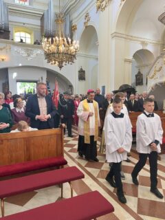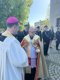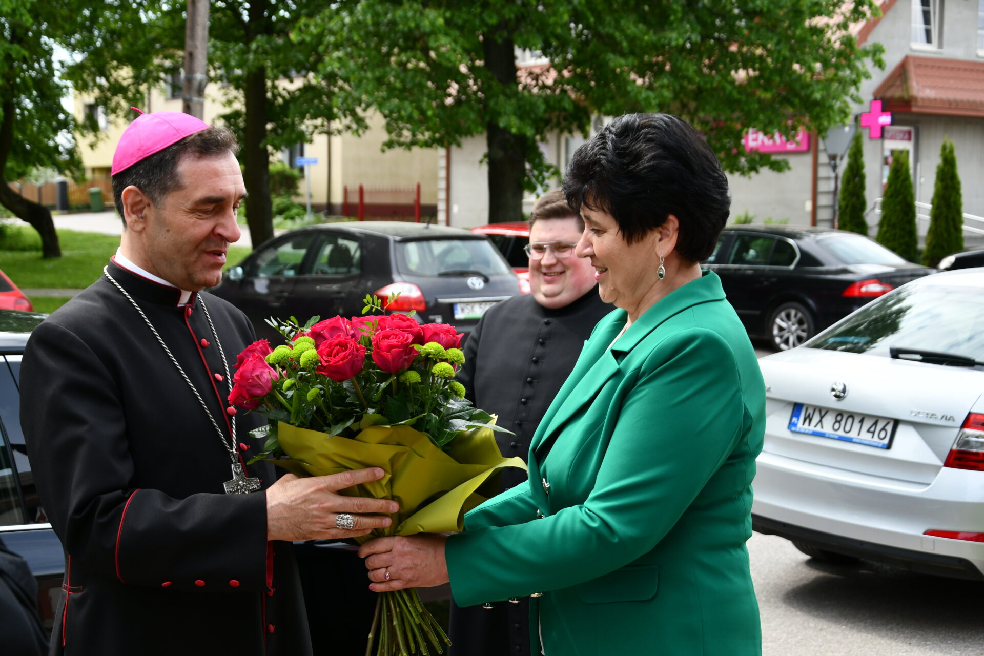 Dwudniowa wizyta rozpoczęła się w niedzielę 21 maja br. od ingresu ks. Biskupa do kościoła parafialnego. Uroczystego charakteru nadały poczty sztandarowe Ochotniczych Straży pożarnych oraz strażacka orkiestra dęta. Po powitaniu administrator parafii ks. kan. Andrzej Witerski przestawił sprawozdanie z dotychczasowej dzielności parafii. Podczas Eucharystii ks. Biskup otaczał modlitwą całą wspólnotę parafialną. W homilii pasterz diecezji nawiązał do święta Wniebowstąpienia Pańskiego. „Wniebowstąpienie to niesamowite wyniesienie człowieczeństwa, nobilitacja tego, co cielesne. Od momentu wstąpienia Chrystusa do nieba, nie jest już ono zasiedlone wyłącznie przez anioły, istoty duchowe, ale wstęp do nieba otrzymują również istoty cielesne. Chrystus jako pierwszy, potem ci, którzy złączyli się z Nim przez chrzest, stali się do Niego podobni, zostali obdarowani nadprzyrodzonym życiem” – powiedział. Jednocześnie przypomniał, że święto to „każe nam podnieść wzrok, podnieść serce ku górze, a z drugiej strony twardo stanąć na ziemi. Zostając na ziemi zostajemy tu jako uczniowie Jezusa, ludzie wezwani do świętości i zarazem ludzie odpowiedzialni za dzieło zbawienia”.