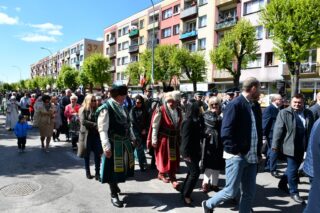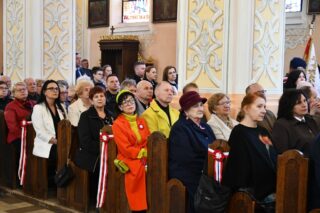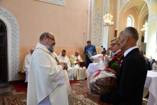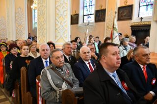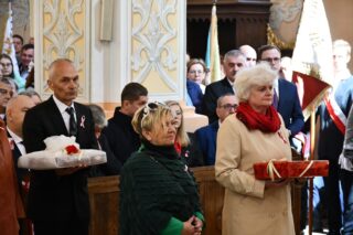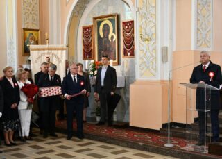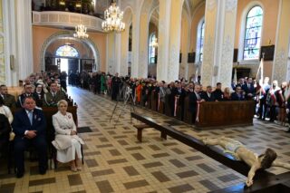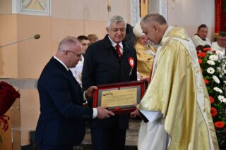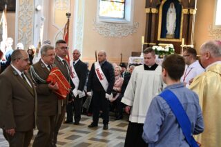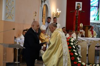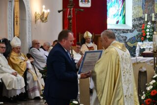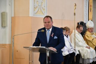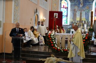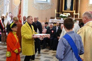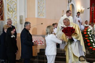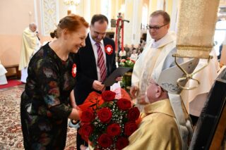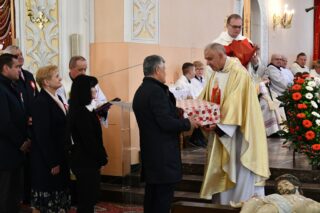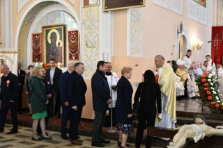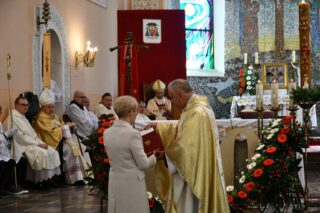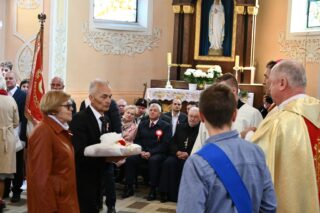 Podczas procesji z darami poszczególni przedstawiciele ofiarowali m.in. monstrancję, naczynia liturgiczne, szaty liturgiczne, Mszał oraz chorągiew z wizerunkiem bł. Stefana Wyszyńskiego. Na zakończenie Eucharystii nie zabrakło wystąpień zaproszonych gości, którzy na ręce ks. Proboszcza składali słowa gratulacji z okazji stulecia parafii i życzyli Bożego błogosławieństwa i dalszego rozwoju wspólnoty parafialnej. List gratulacyjny od premiera rządu Mateusza Morawieckiego odczytał wiece premier Jacek Sasin. W przemówieniach podkreślono fakt, że powołanie i istnienie rzymskokatolickiej parafii ściśle łączy się z historią miasta. Wśród zaproszonych gości nie zabrakło duchowieństwa rzymskokatolickiego i prawosławnego, sióstr zakonnych, przedstawicieli Europarlamentu, władz parlamentarnych, samorządowych, służb mundurowych. Swoja obecnością zaszczyciły licznie przybyłe poczty sztandarowe.