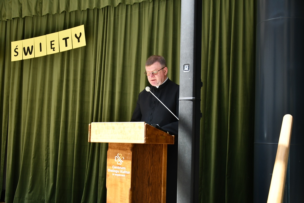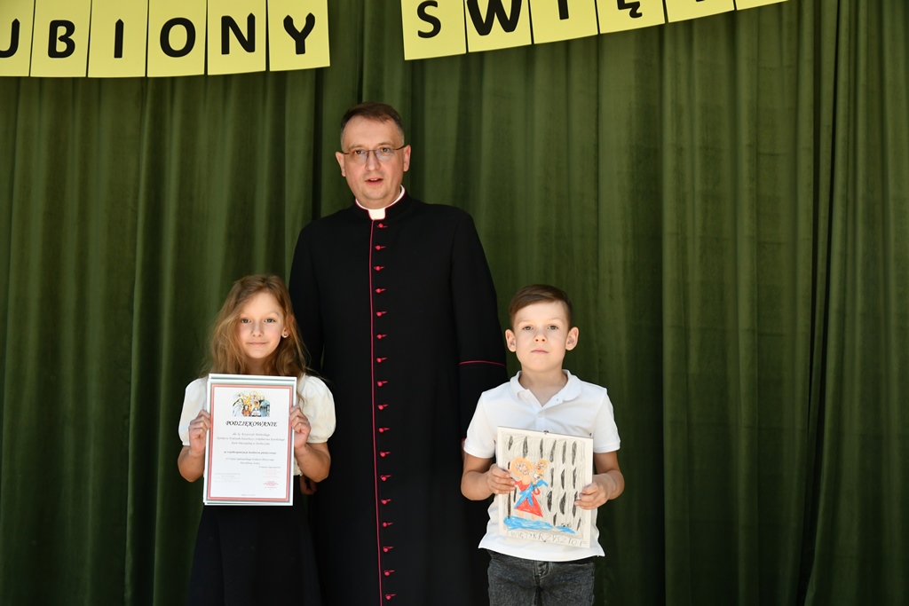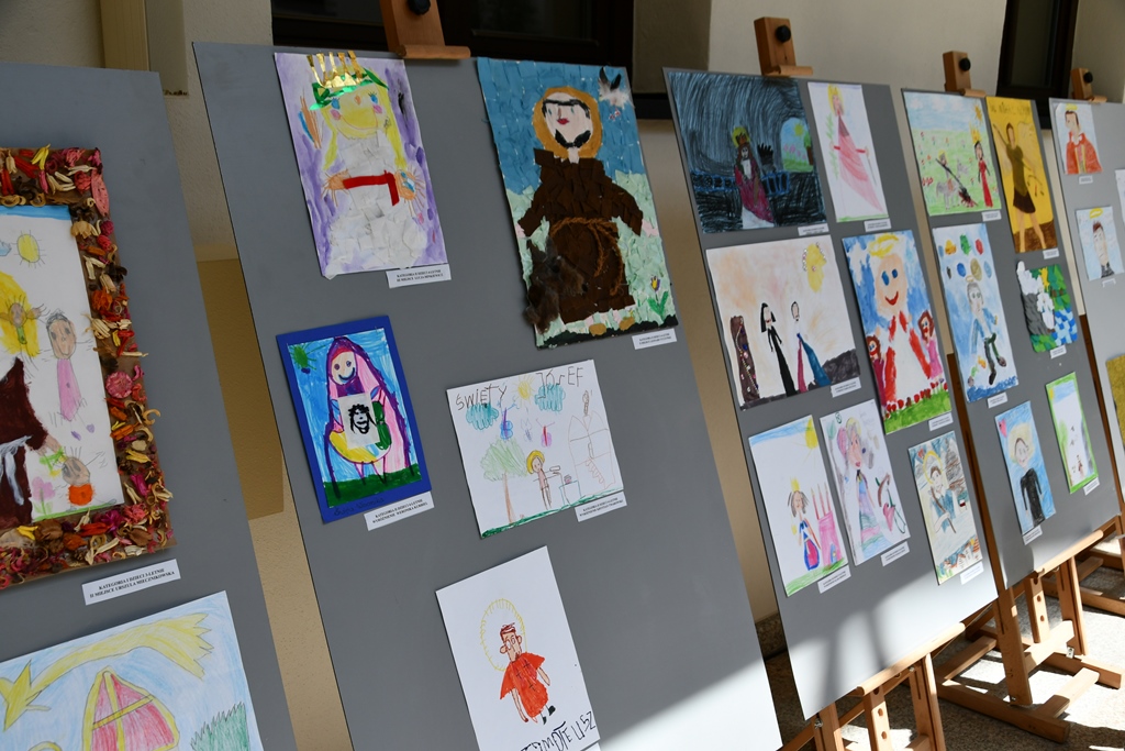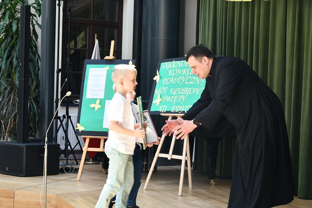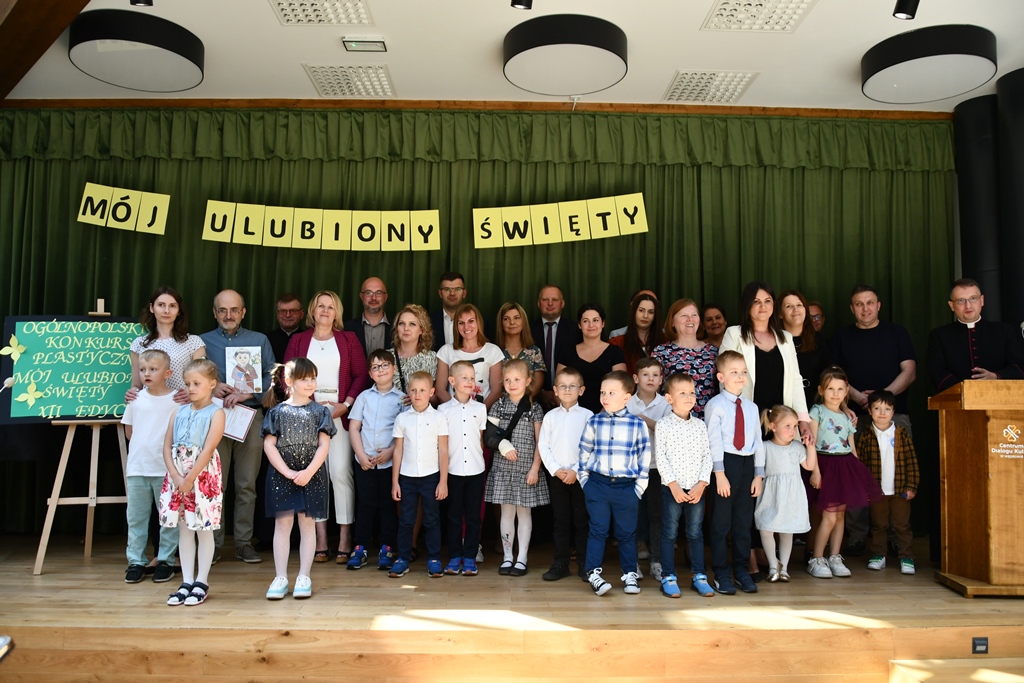 Po Nim miało miejsce przemówienie ks. kan. Krzysztofa Mielnickiego. W swoim wystąpieniu Dyrektor Wydział Katechezy ukazał idee i założenia konkursu oraz podsumował przebieg wszystkich etapów konkursu i prac komisji, które wyłoniły laureatów. Wyraził nadzieję, że dzieci, które wzięły udział w konkursie prezentując swojego ulubionego świętego, rzeczywiście będą starały się naśladować jego miłość do Boga w swoim życiu. Pragnieniem organizatorów jest także to, aby kiedy już dorosną i będą posiadać własne potomstwo, będą wybierać im imiona świętych katolickich – dając im wspaniałych orędowników w Niebie – mówił ks. Mielnicki. Podziękował Członkom Komisji Konkursowej  – Agnieszce Maksymowicz i Romanowi Postkowi – za ich pracę, często nie łatwą. Zdarzało się bowiem, że uczestnicy konkursu nie podpisali swojej pracy imieniem żadnego świętego, trzeba było zatem zgadywać kto to może być. Ks. Krzysztof Mielnicki zaznaczył, że tegoroczna edycja przynosi nowość w postaci V kategorii Konkursowej – praca z rodziną. Wspomniał, że we wcześniejszych edycjach zauważano, że prace były wykonywane niesamodzielnie. Szkoda było je odrzucać z tego powodu. Zaproponowano zatem, aby w tym roku oprócz czterech kategorii wiekowych: Trzylatki, Czterolatki, Pięciolatki i Sześciolatki, pojawiła się także kategoria: Praca z Rodziną. Przyniosło to pozytywne wyniki w postaci przepięknych prac konkursowych.