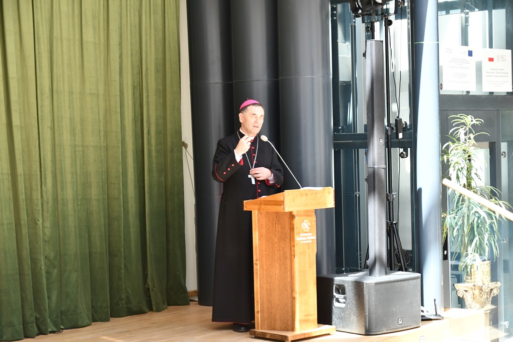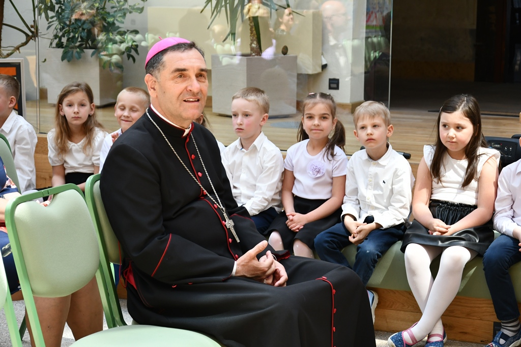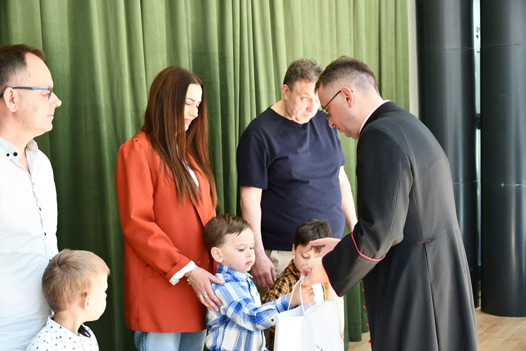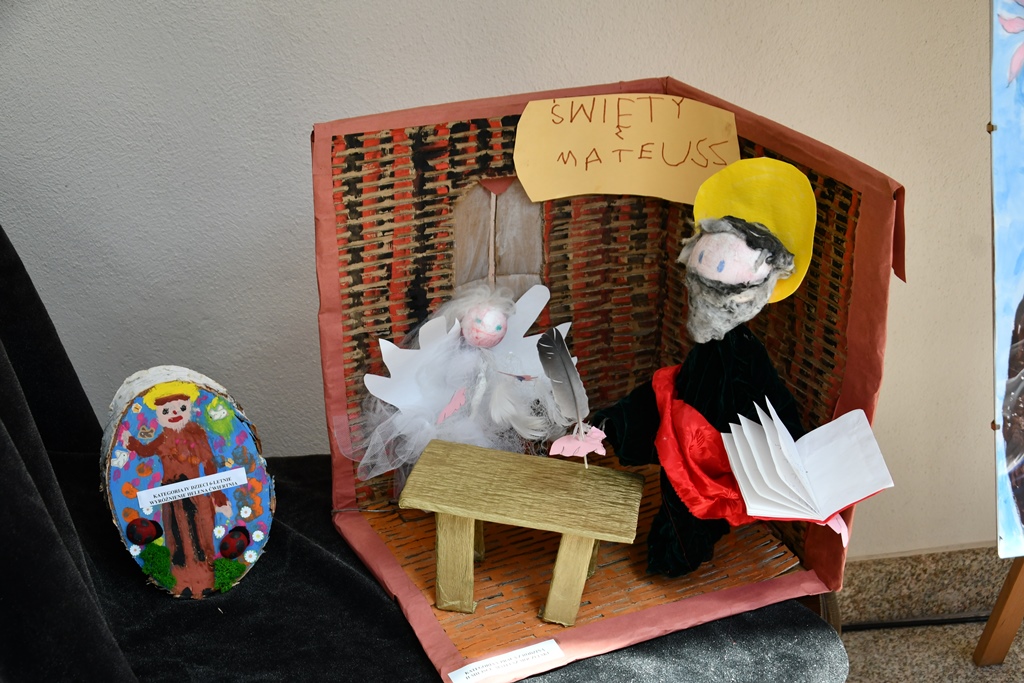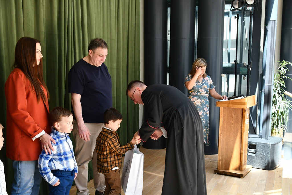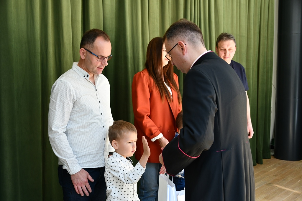 Po Nim miało miejsce przemówienie ks. kan. Krzysztofa Mielnickiego. W swoim wystąpieniu Dyrektor Wydział Katechezy ukazał idee i założenia konkursu oraz podsumował przebieg wszystkich etapów konkursu i prac komisji, które wyłoniły laureatów. Wyraził nadzieję, że dzieci, które wzięły udział w konkursie prezentując swojego ulubionego świętego, rzeczywiście będą starały się naśladować jego miłość do Boga w swoim życiu. Pragnieniem organizatorów jest także to, aby kiedy już dorosną i będą posiadać własne potomstwo, będą wybierać im imiona świętych katolickich – dając im wspaniałych orędowników w Niebie – mówił ks. Mielnicki. Podziękował Członkom Komisji Konkursowej  – Agnieszce Maksymowicz i Romanowi Postkowi – za ich pracę, często nie łatwą. Zdarzało się bowiem, że uczestnicy konkursu nie podpisali swojej pracy imieniem żadnego świętego, trzeba było zatem zgadywać kto to może być. Ks. Krzysztof Mielnicki zaznaczył, że tegoroczna edycja przynosi nowość w postaci V kategorii Konkursowej – praca z rodziną. Wspomniał, że we wcześniejszych edycjach zauważano, że prace były wykonywane niesamodzielnie. Szkoda było je odrzucać z tego powodu. Zaproponowano zatem, aby w tym roku oprócz czterech kategorii wiekowych: Trzylatki, Czterolatki, Pięciolatki i Sześciolatki, pojawiła się także kategoria: Praca z Rodziną. Przyniosło to pozytywne wyniki w postaci przepięknych prac konkursowych.