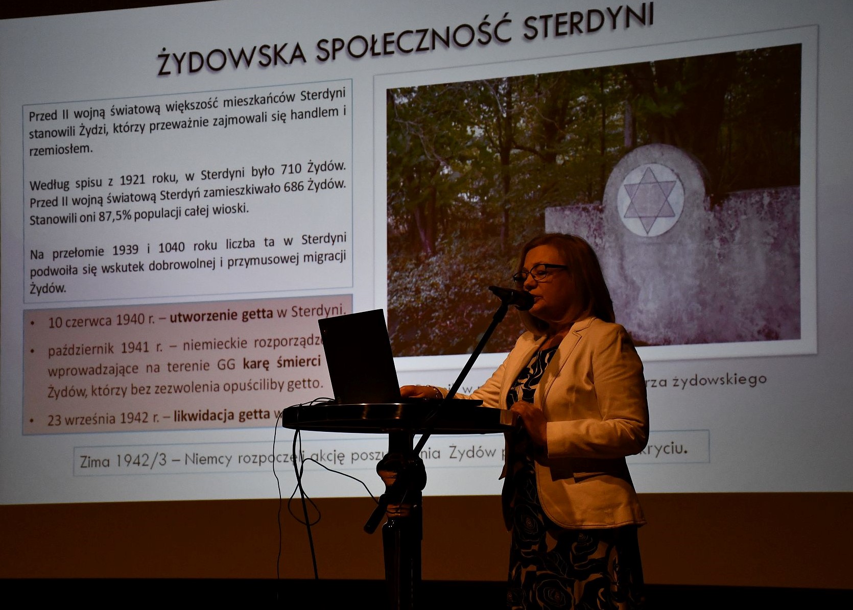 W czasie spotkania w GOKiS szczegóły tragicznych wydarzeń przybliżyła licznie zebranym historyk Joanna Oleszczuk, rodzinnie związana z Paulinowem. Prelegentka mówiła też o społeczności żydowskiej zamieszkującej Sterdyń przed wojną oraz o likwidacji miejscowego getta. Podkreślała zasługi instytucji i osób, w tym ś.p. Stanisławy Maciak, wieloletniej sekretarz TMZS, dzięki którym pamięć o zamordowanych przetrwała. prezentację zakończyła słowami: „Pielęgnowanie pamięci o mieszkańcach Paulinowa i Ratyńca Starego, którzy stracili życie pomagając Żydom przetrwać wojnę, jest zadaniem wszystkich, nie tylko w wymiarze lokalnym, bowiem ważną częścią dziedzictwa każdego narodu jest kultywowanie pamięci o tych, którzy swoją bohaterską postawą zapisali się w historii Ojczyzny.”