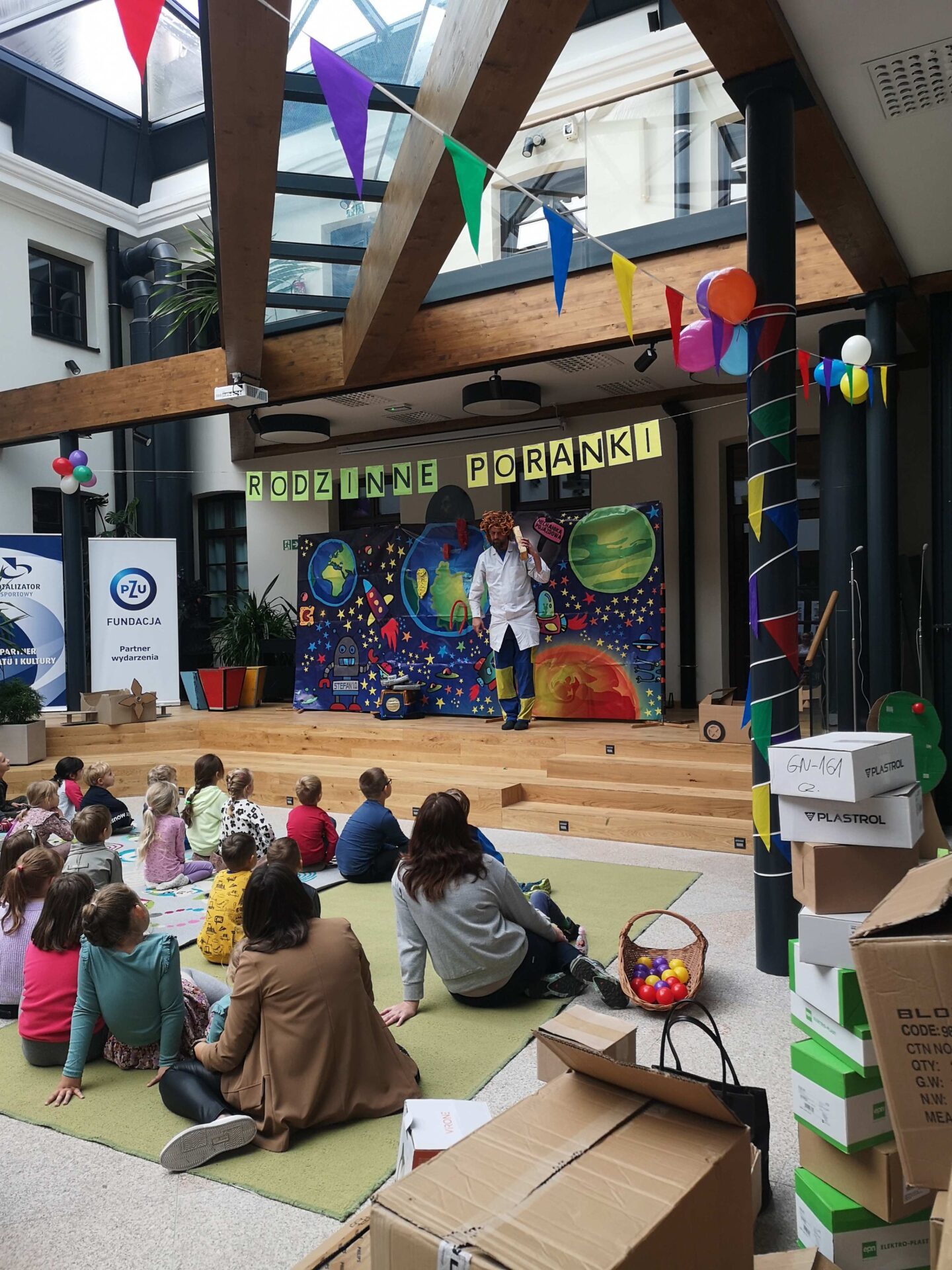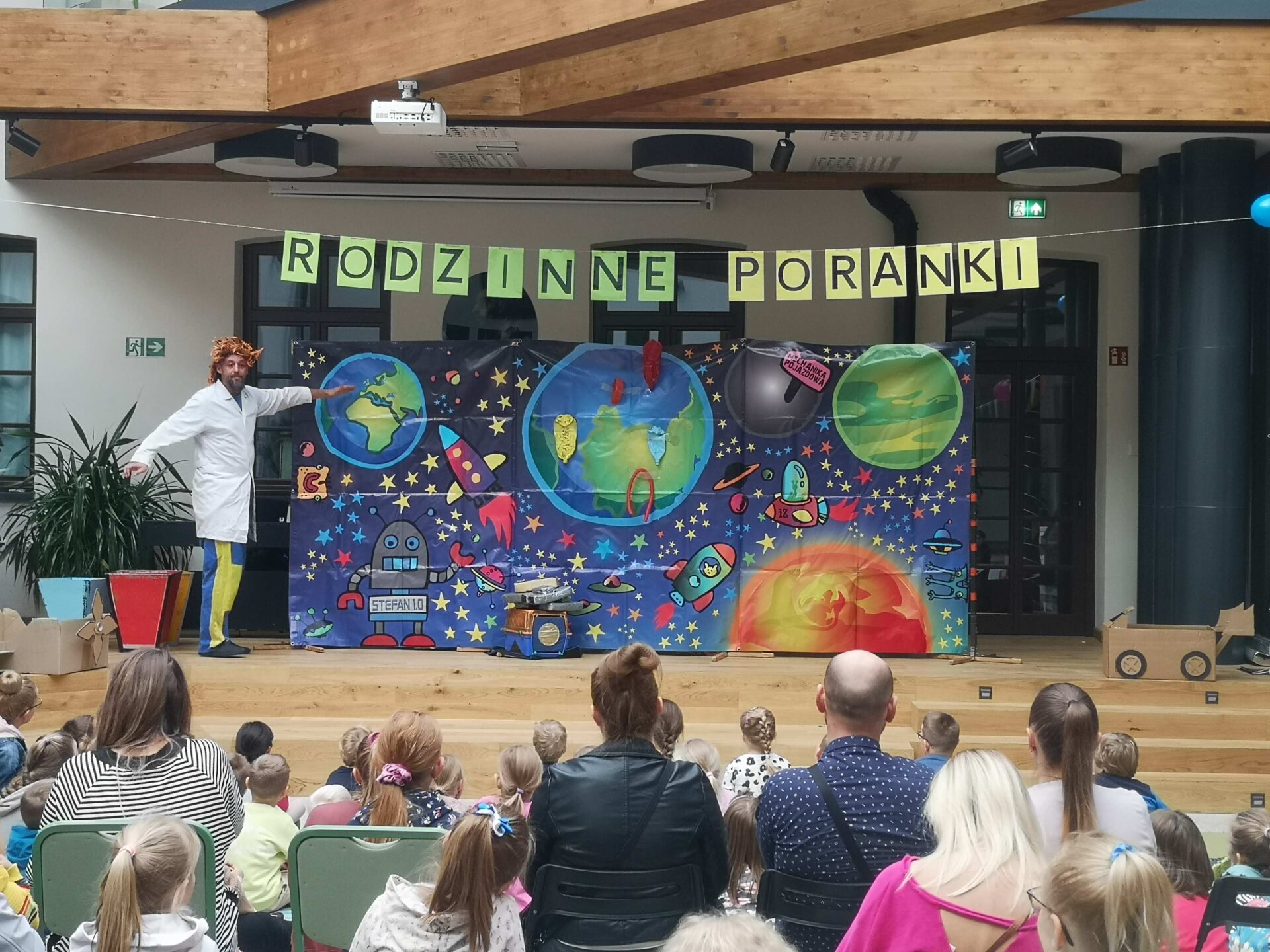 Sobotni poranek okazał się super zabawą dla całej rodziny. Spotkanie rozpoczęło się spektaklem teatralnym o ekologii, który został poprowadzony przez Pomarańczowy Cylinder pn. „Profesorek Wodorek w kosmosie”.