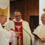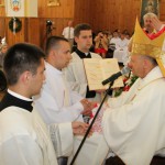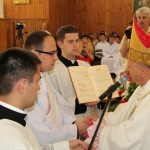 Ksiądz biskup podziękował rodzinom neoprezbiterów za tworzenie atmosfery wspierającej powołania. Wręczył uroczyście dekrety święceń i pierwsze nominacje na stanowiska wikariuszy – ks. Krzysztofowi Nagórnemu do parafii p. w. św. Piotra Alkantary i św. Antoniego z Padwy w Węgrowie, ks. Emilowi Skoblowi do parafii p.w. Wniebowzięcia NMP w Węgrowie, a ks. Łukaszowi Wojewódzkiemu do parafii p.w. Matki Bożej z Góry Karmel w Bielsku Podlaskim. Ks. Łukasz Wojewódzki podziękował w imieniu wszystkich za udzielenie święceń, ks. bp Tadeuszowi Pikusowi oraz wszystkim, wspierających ich na drodze do kapłaństwa.