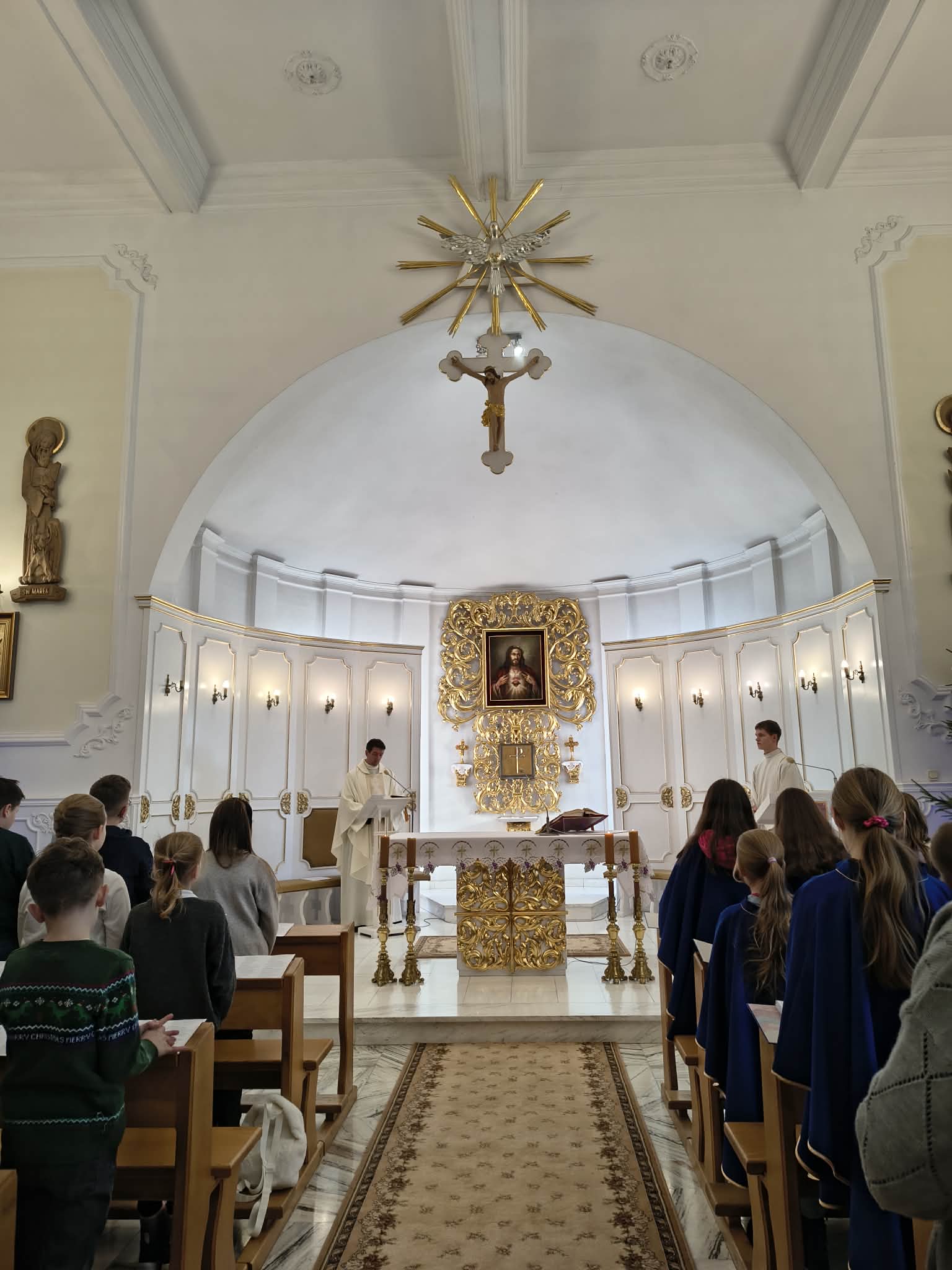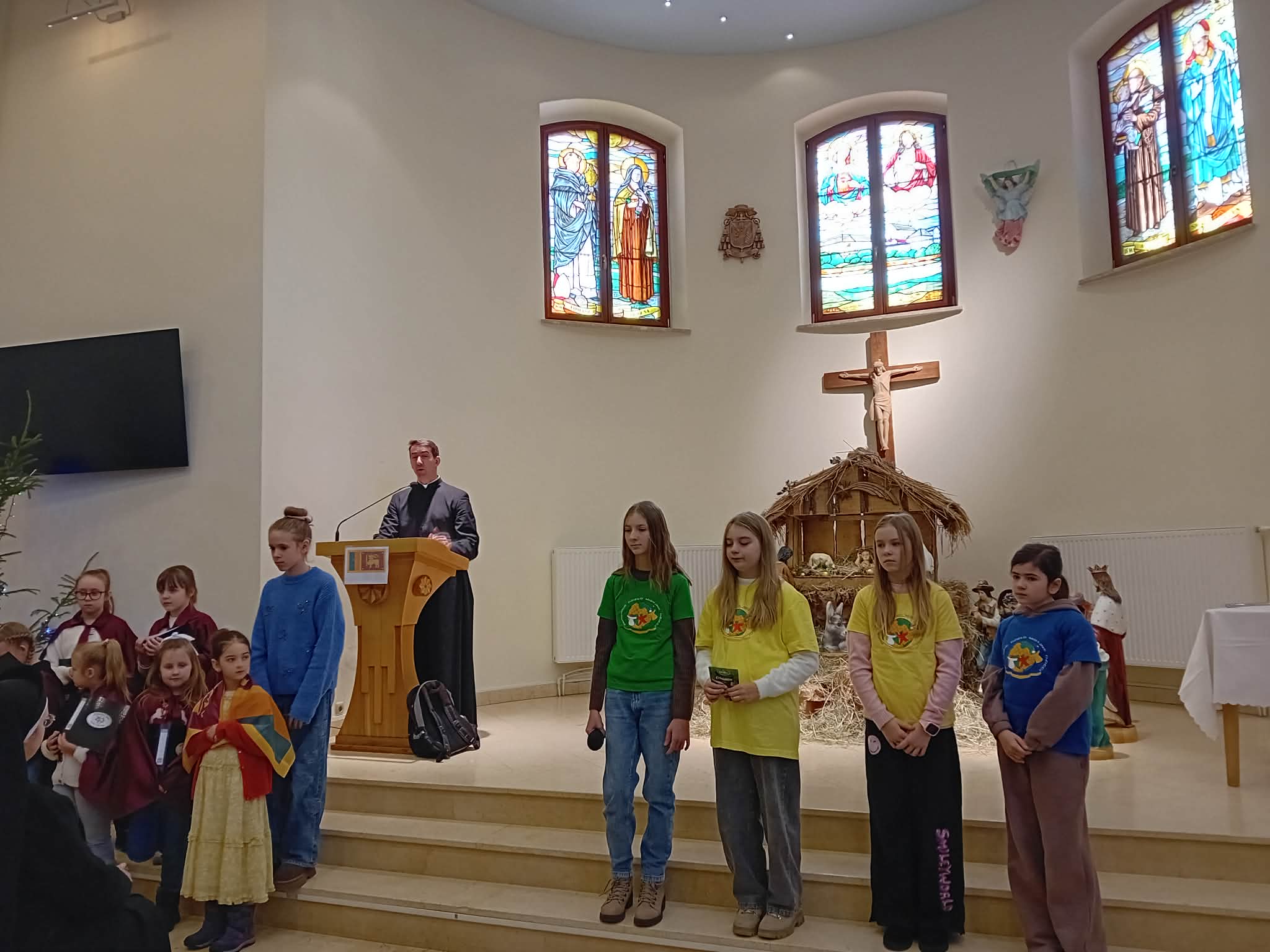 Spotkanie rozpoczęło się Mszą św. w kaplicy seminaryjnej, którą ks. Mirosław odprawił w intencji Kolędników Misyjnych i wszystkich obecnych na spotkaniu dzieci i ich opiekunów.  Podczas homilii celebrans przypomniał, że główną ideą kolędowania misyjnego jest niesienie ludziom radosnej nowiny o miłości Boga do człowieka oraz zachęcanie do pomocy biednym dzieciom w krajach misyjnych. Przedstawił  trudną  sytuację dzieci na Sri Lance, dla których będą przeznaczone zbierane ofiary materialne. Stwierdził, że kolędujące dzieci są pomocnikami Papieża w dziełach misyjnych. Wyjaśnił też, co oznacza pamiątka w kształcie liścia betelu – symbolu szacunku i przyjaźni, którą  kolędnicy zostawiali u rodzin, u których kolędowali oraz ciekawą symbolikę flagi kraju. Mówił też, że Pan Jezus przyszedł do tych, którzy potrzebują pomocy, a kolędujące dzieci stały się Jego rękami i sercem dla biednych dzieci. Z Jezusem nie musimy się bać i możemy odważnie czynić dobro. Podziękował dzieciom za podjęty trud kolędowania oraz wszystkim opiekunom i rodzicom, którzy pomogli dzieciom w tej akcji. Oprawę muzyczną podczas Mszy św. zapewniła schola dziecięca z Sokołowa Podlaskiego.
