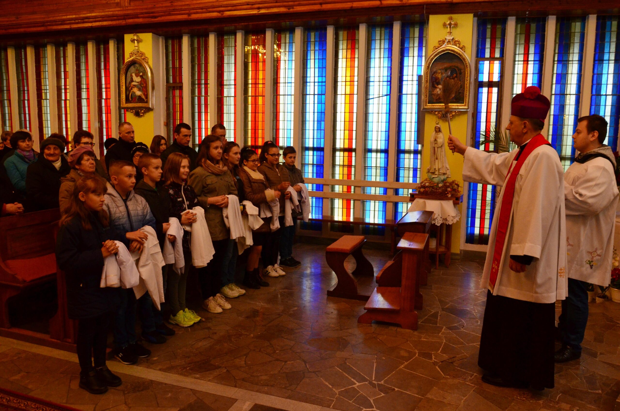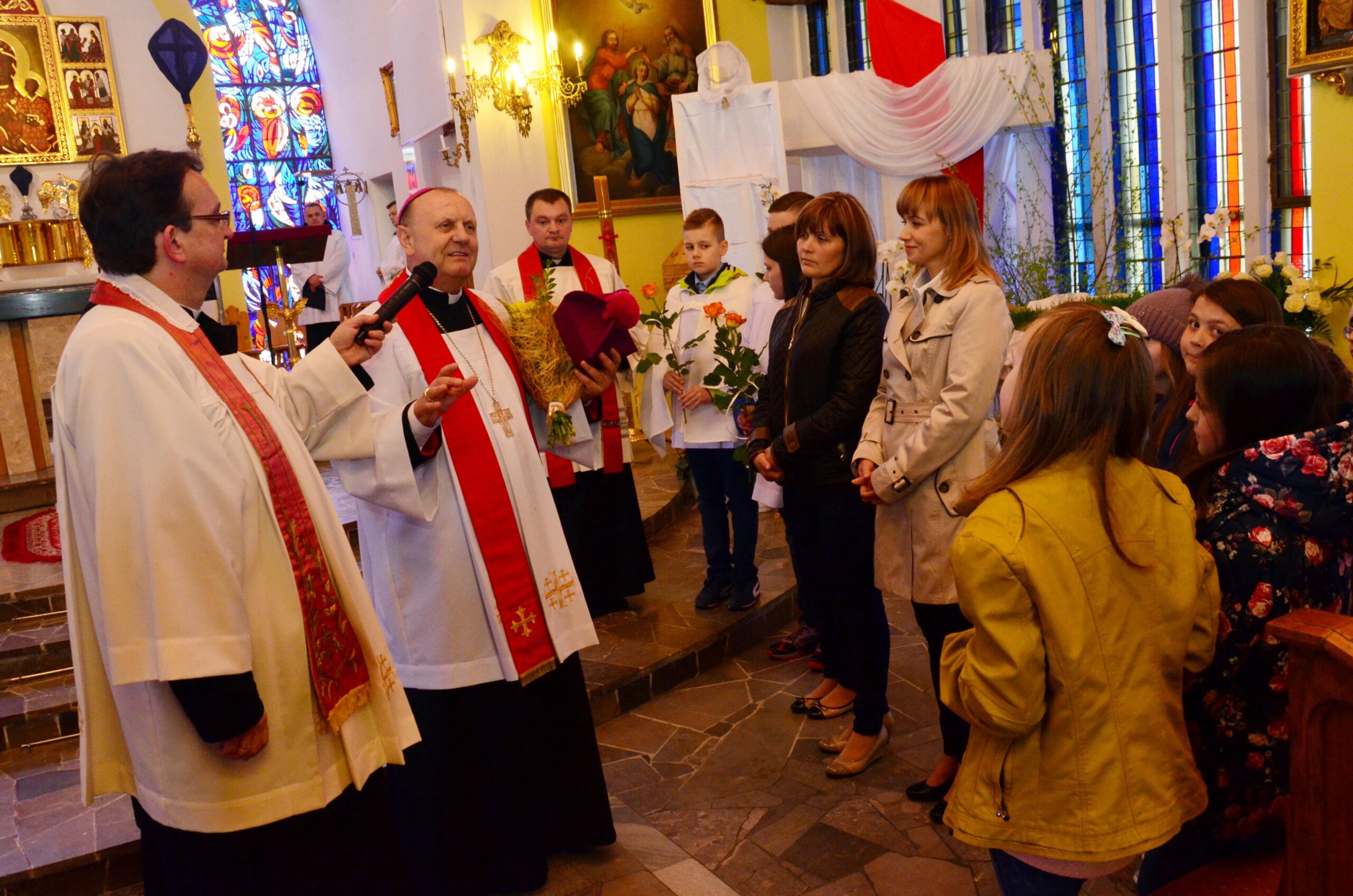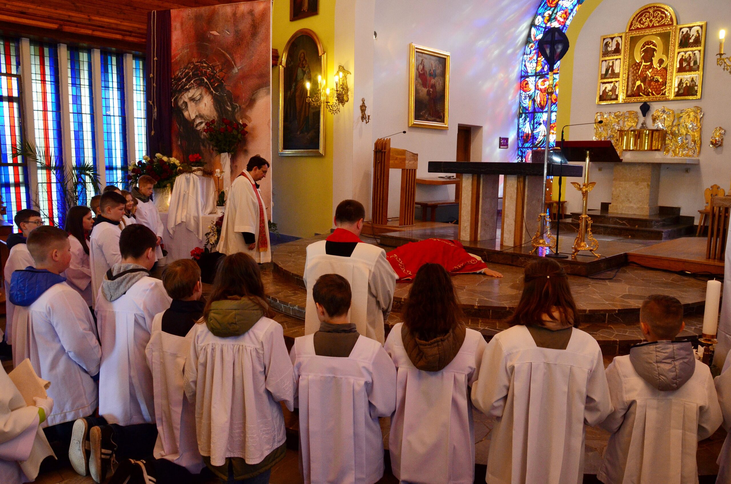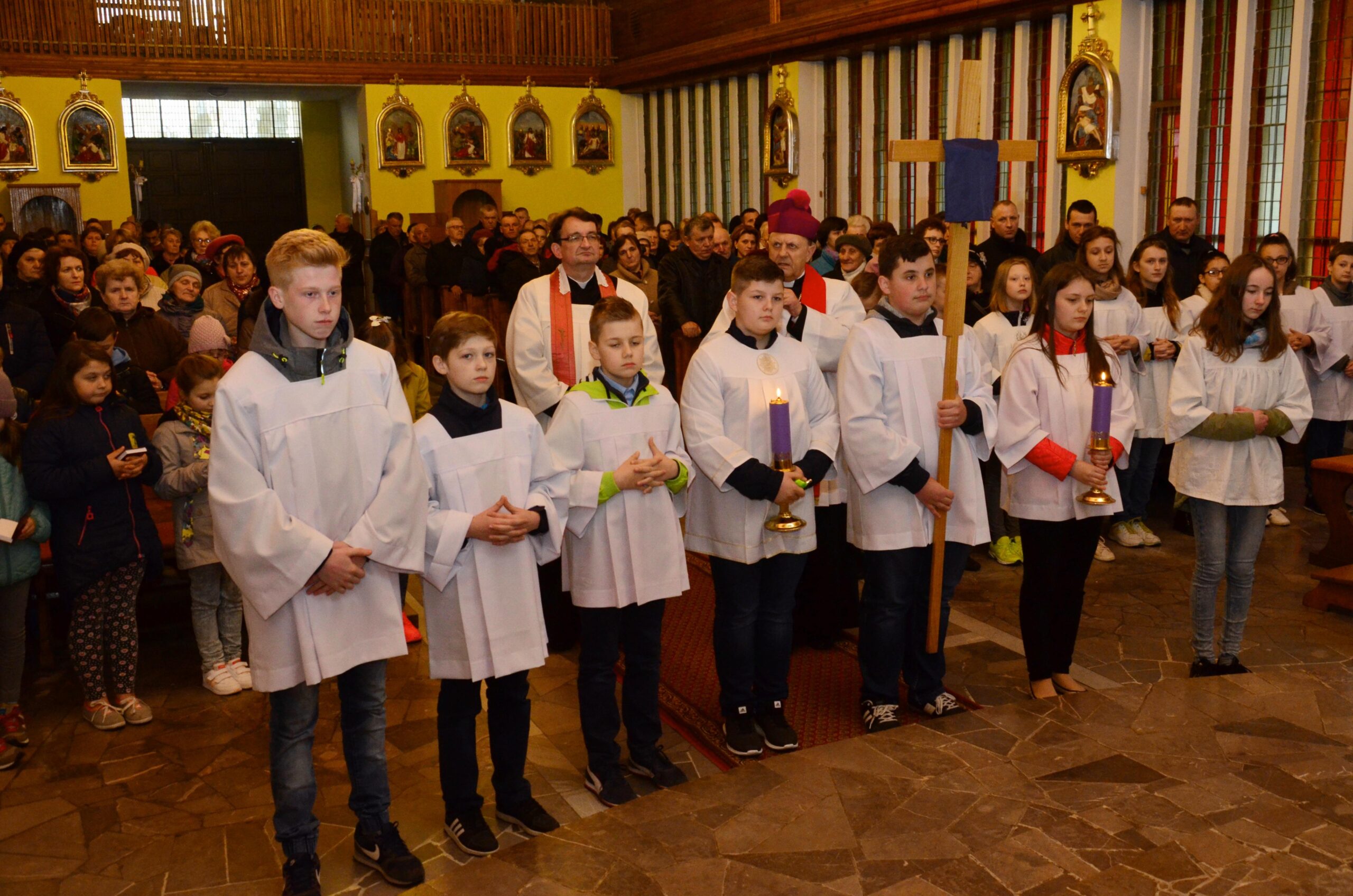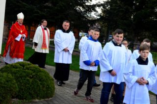 Liturgię rozpoczęto od pobłogosławienia modlitewników dla dzieci pierwszokomunijnych oraz komż, które dzisiejszego dnia założyli po raz pierwszy nowi ministranci i nowe ministrantki parafii. Kolejnym punktem była wspólna Droga Krzyżowa, która odbyła się w kościele. Po jej zakończeniu rodzice dzieci, które w tym roku przyjmą pierwszą Komunię Świętą podziękowali za obecność i wspólną modlitwę Księdzu Biskupowi. Po tych podziękowaniach rozpoczęto właściwe obchody Liturgii Męki Pańskiej.