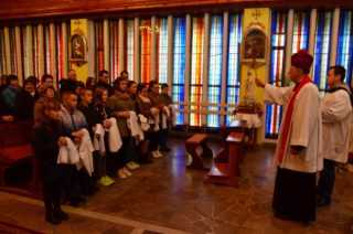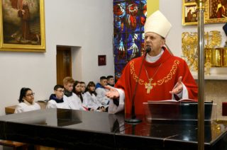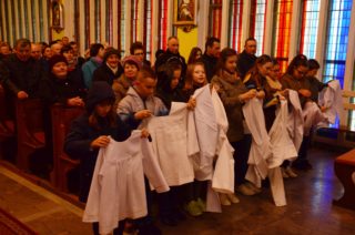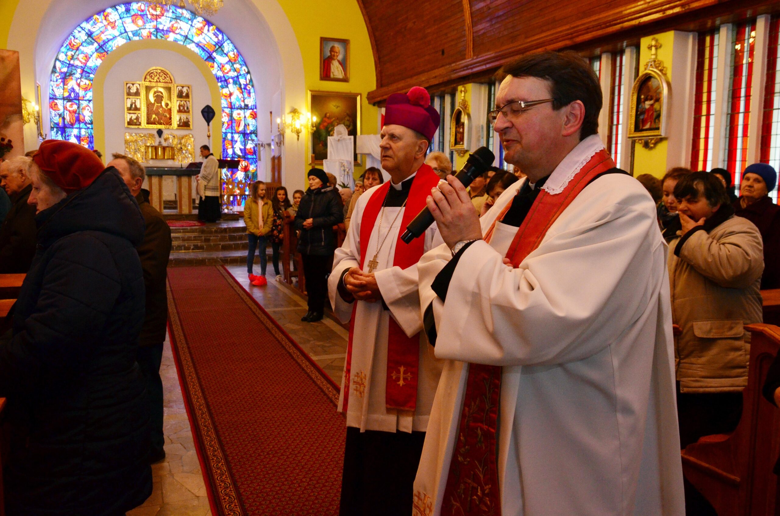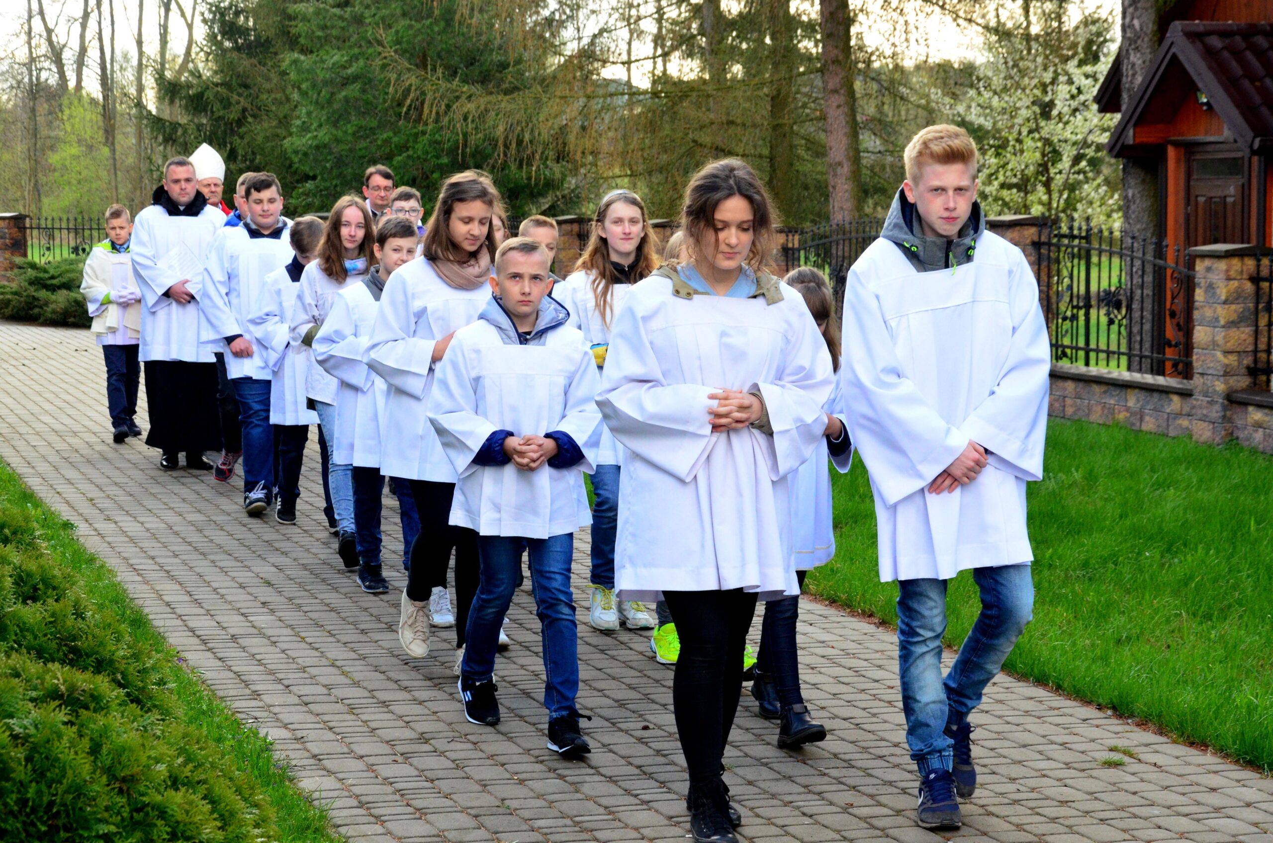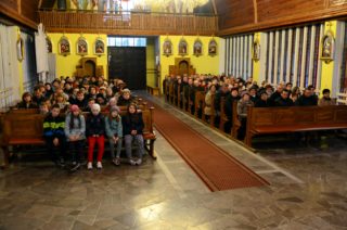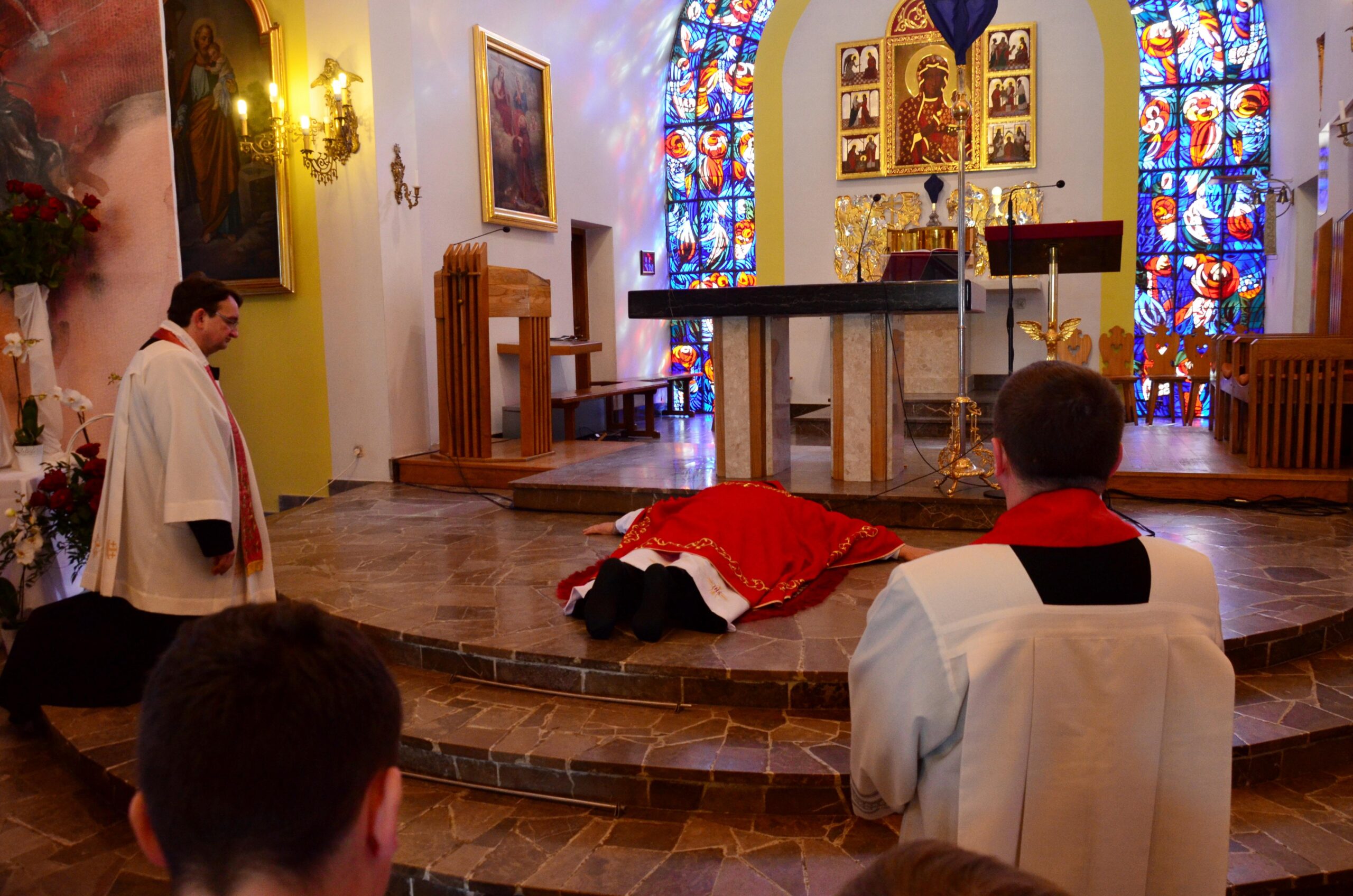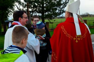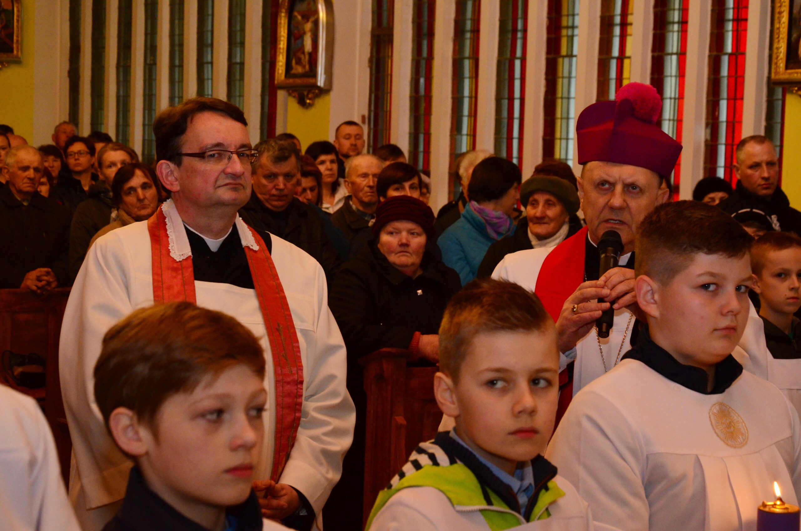 Liturgię rozpoczęto od pobłogosławienia modlitewników dla dzieci pierwszokomunijnych oraz komż, które dzisiejszego dnia założyli po raz pierwszy nowi ministranci i nowe ministrantki parafii. Kolejnym punktem była wspólna Droga Krzyżowa, która odbyła się w kościele. Po jej zakończeniu rodzice dzieci, które w tym roku przyjmą pierwszą Komunię Świętą podziękowali za obecność i wspólną modlitwę Księdzu Biskupowi. Po tych podziękowaniach rozpoczęto właściwe obchody Liturgii Męki Pańskiej.