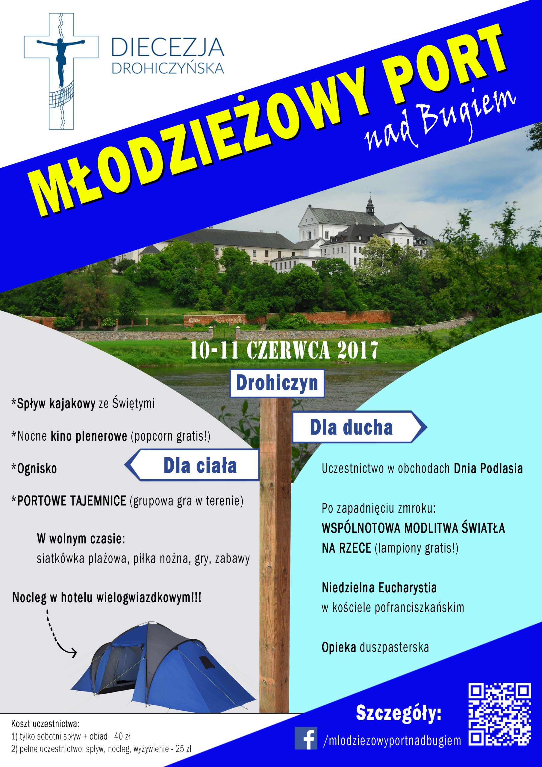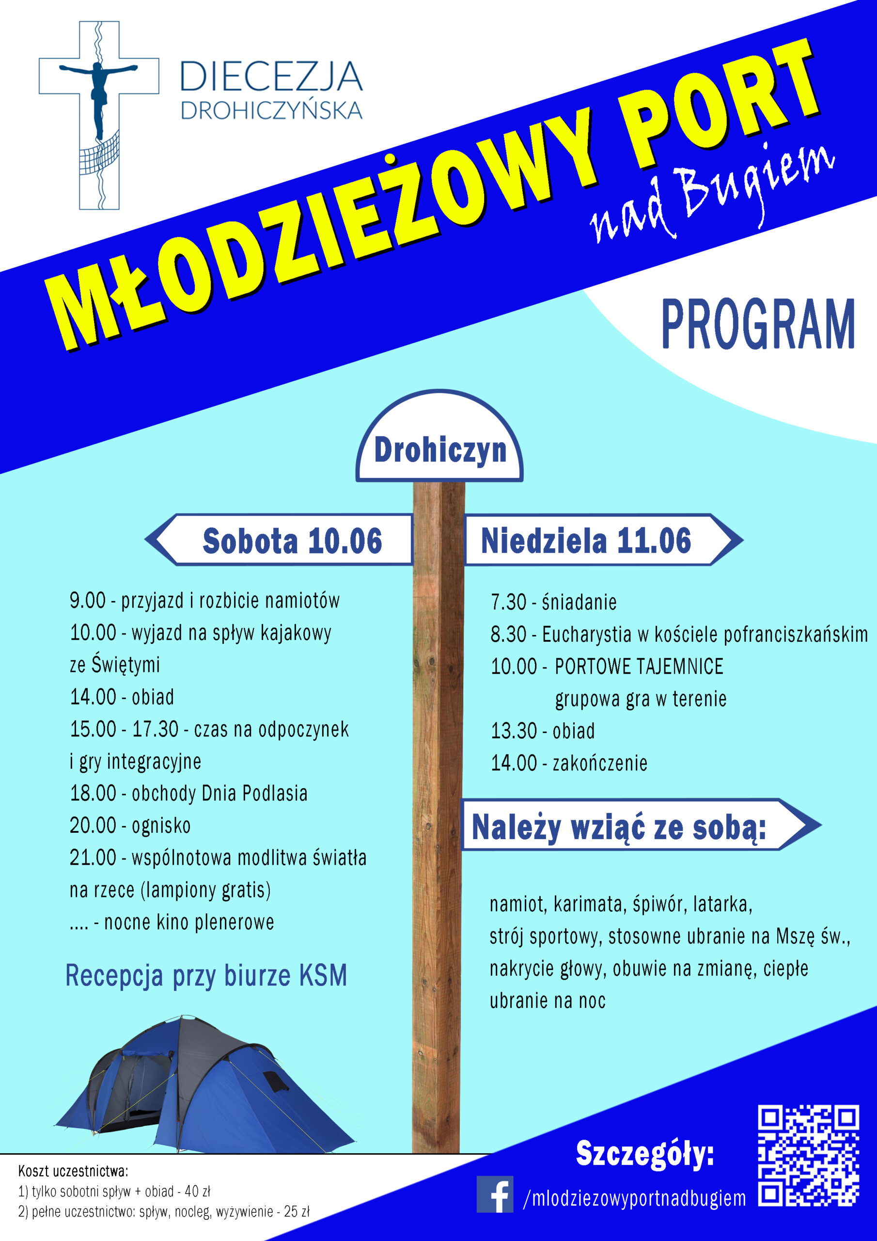 W programie przewidziany jest spływ kajakowy, czas na odpoczynek i gry integracyjne, ognisko, grupowa gra w terenie, nocne kino plenerowe. Młodzieżowy port wpisuje się w obchody Dnia Podlasia. Nie zabraknie czasu na modlitwę a przede wszystkim udziału w Eucharystii szczególnie 10 czerwca o godz. 18:00 w ramach obchodów 18. rocznicy pobytu Jana Pawła II w Drohiczynie.