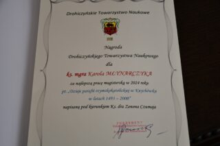 „Dzieje parafii rzymskokatolickiej w Knychówku w latach 1493-2000” – to tytuł pracy magisterskiej autorstwa ks. Karola Młynarczyka, która została nagrodzona przez Drohiczyńskie Towarzystwo Naukowe. Uroczyste wręczenie nagrody miało miejsce 21 lutego 2025 r. w Drohiczynie.