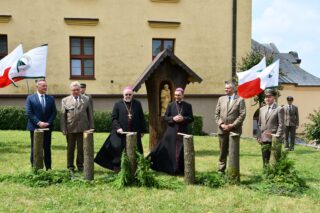 Zanim nastąpiło poświecenie kapliczki, mieli okazję wystąpić zaproszeni goście. Nadleśniczy Artur Gacki zwrócił uwagę, że kapliczka stanęła w roku jubileuszu 10. rocznicy święceń biskupich bpa Piotra Sawczuka. Starosta siemiatycki Marek Bobel podziękował odznaczonemu dyrektorowi Andrzejowi Nowakowi za jego prace, zaangażowanie oraz troskę o wartości chrześcijańskie i patriotyczne. Andrzej Nowak podziękował za wyróżnienie. Jak zauważył, kapliczki zdobiące nasze tereny są znakiem żywej wary i pamięci. Ks. Tomasz Duszkiewicz, który animował i prowadził spotkanie, podkreślił, że w odznaczeniu przyznanym dyrektorowi wyraża się wdzięczność wszystkim leśnikom działającym w regionie. Radość wraził bp Antoni Dydycz. Pokreślił znaczenie tego rodzaju spotkań, które doceniają działalność różnych grup, w tym przypadku leśników. Adam Jakuć – redaktor naczelny białostockiego oddziału Polska Press podziękował za zaproszenie oraz zapewnił, że polskie media będą stały na straży wartości oraz broniły Kocioła i leśników.