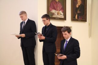Kolejna część spotkania miała miejsce w auli seminaryjnej. Rektor seminarium z należytą starannością przywitał przybyłych gości, wśród których znaleźli się przedstawiciele duchowieństwa, sióstr zakonnych, dziekani i rektorzy zaprzyjaźnionych uczelni na czele z Akademią Katolicką w Warszawie, przedstawiciele władz rządowych, samorządowych, oświatowych, służb mundurowych, prezesi instytucji, urzędów i firm. Słowa szczególnych pozdrowień skierował do alumnów seminarium, zwłaszcza tych z pierwszego roku, którzy rozpoczynają formacje seminaryjną. Łukasz Łyskawy z par. Trójcy Przenajświętszej w Ciechanowcu, Szymon Myszkowski z par. Chrystusa Króla w Ogrodnikach oraz Michał Okulus z parafii św. Stanisława Kostki w Jerzyskach – jako alumni pierwszego roku publicznie złożyli ślubowanie. Wśród świadków tego wydarzenia obecni byli ich rodzice i bliscy. Przedstawiciel Akademii Katolickiej w Warszawie ks. dr Michał Polny wręczył nowym studentom indeksy. W imieniu alumnów przemówił Łukasz Łyskawy. Wyraził radość za faktu wstąpienia do seminarium oraz świadomość spoczywającej odpowiedzialności. „Stoi przed nami wiele poważnych zadań, ale jednocześnie przepełnia nas radość i szczęście, że możemy kroczyć drogą naszego Nauczyciela Jezusa Chrystusa. Dołączając do tej wspólnoty obiecujemy dbać o dobre imię naszego Seminarium, wypełniać nasze obowiązki oraz z wiernością i pokorą rozwijać się duchowo, abyśmy faktycznie stawali się uczniami Chrystusa” – powiedział.