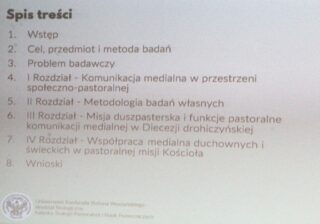 Tematem pracy, napisanej pod kierunkiem ks. prof. dr hab. Jana Kazimierza Przybyłowskiego było: „Komunikacja medialna w duszpasterstwie diecezji drohiczyńskiej”.