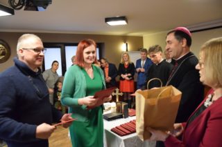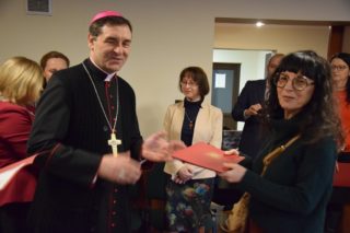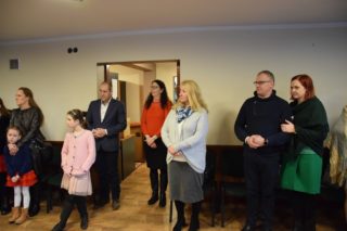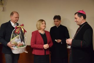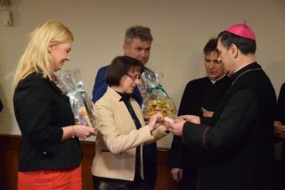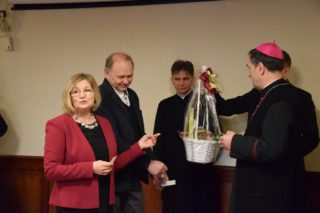 Druga część spotkania miała miejsce w sali konferencyjnej domu parafialnego. Najpierw głos zabrał ks. Biskup, który docenił trud służby na rzecz małżeństw i rodzin, a następnie przekazał zebranym serdeczne życzenia na rozpoczęty Nowy 2022 Rok. W imieniu przybyłych życzenia ks. Biskupowi złożyli kolejno: gospodarz spotkania ks. Piotr Arbaszewski, Małgorzata Łukaszewicz-Ufnal – Diecezjalny Doradca Życia Rodzinnego oraz Alicja Karczewska liderka wspólnoty SYCHAR. Następnie zebrani podzielili się opłatkiem.