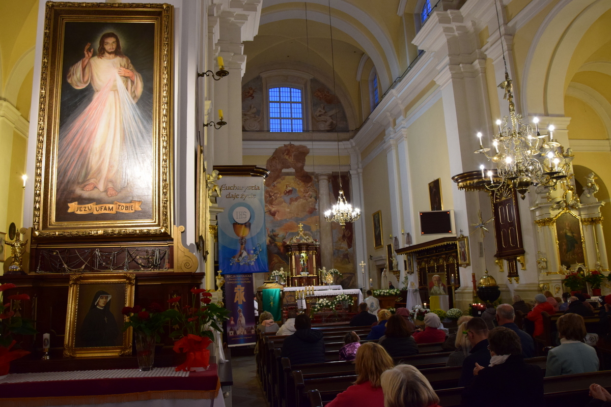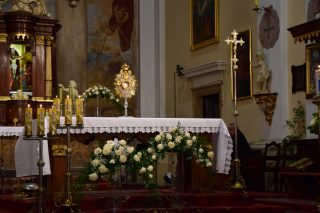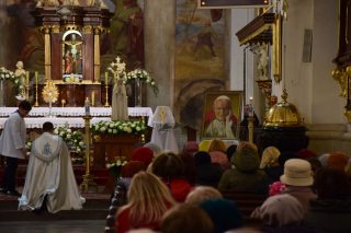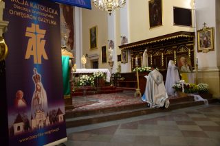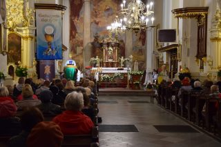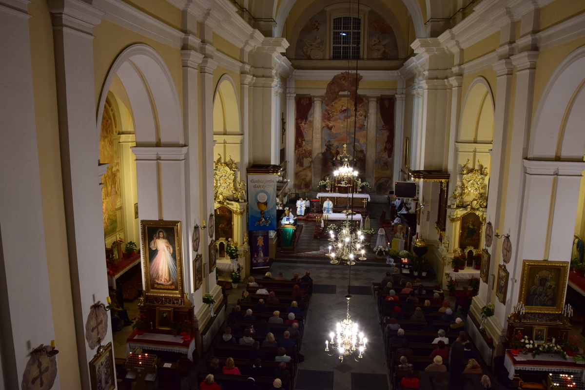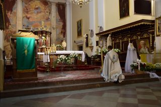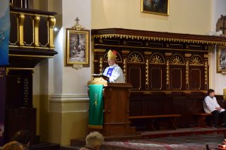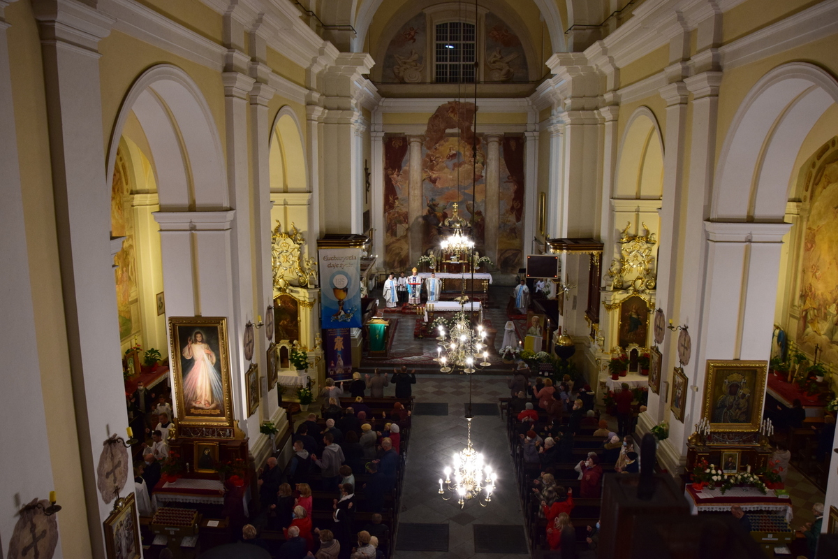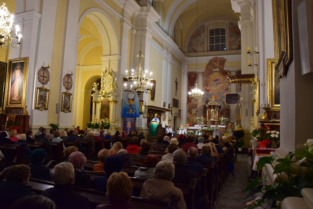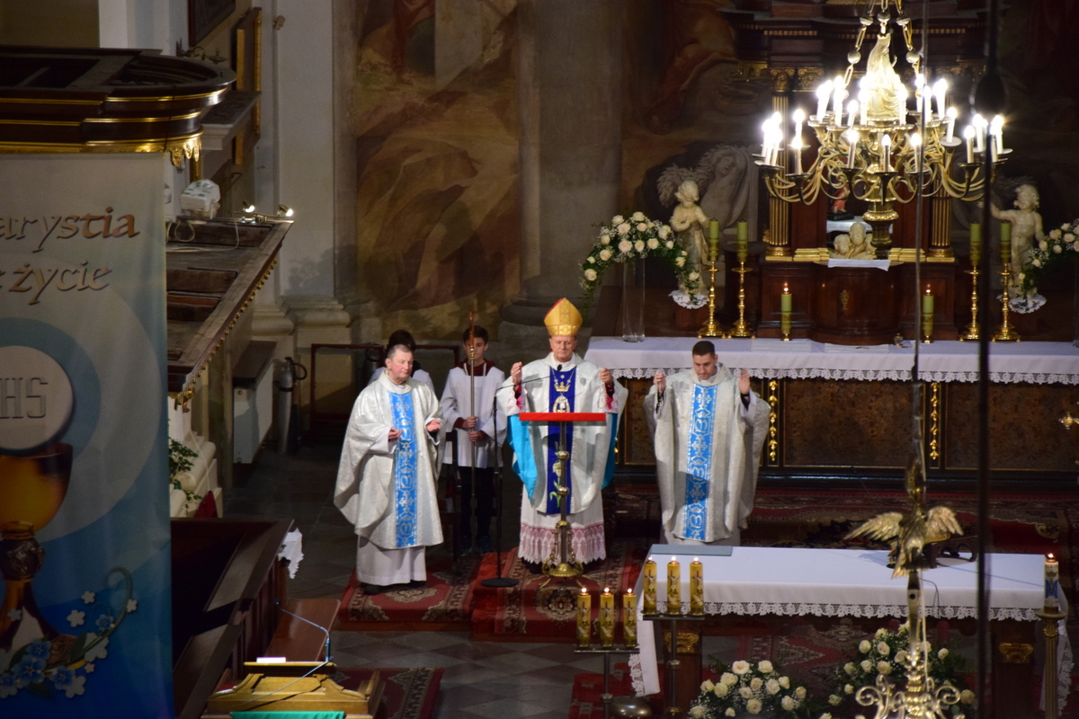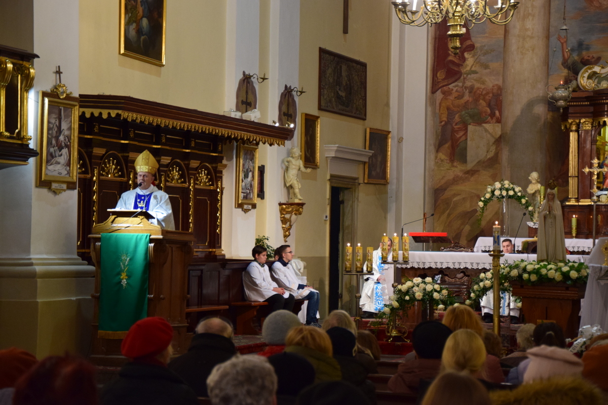 Mszy św. o godz. 18 przewodniczył ks. bp Tadeusz Pikus. Niestety, z uwagi na deszczową pogodę, tradycyjna procesja różańcowa do czterech ołtarzy, symbolizujących kolejne tajemnice różańca, została przeniesiona do środka kościoła. Jednak mimo to, i w świątyni udało się uformować okrojoną procesję z figurą Matki Bożej Fatimskiej, w której skład weszli miejscowi księża, kapłani przybyli z sąsiednich parafii oraz liturgiczna służba ołtarza. Wierni zgromadzeni w bazylice mogli uczestniczyć w modlitwie, pozostając na swoich miejscach, a odwracając się sukcesywnie w kierunku, gdzie podążała figura Najświętszej Maryi Panny. Krótkie, ale bogate w treści rozważania poszczególnych tajemnic różańcowych przygotował i wygłosił ks. Biskup.