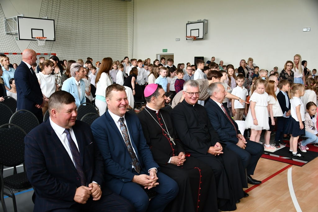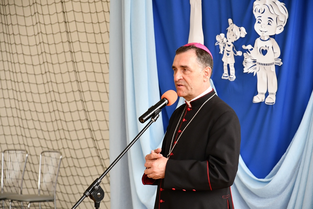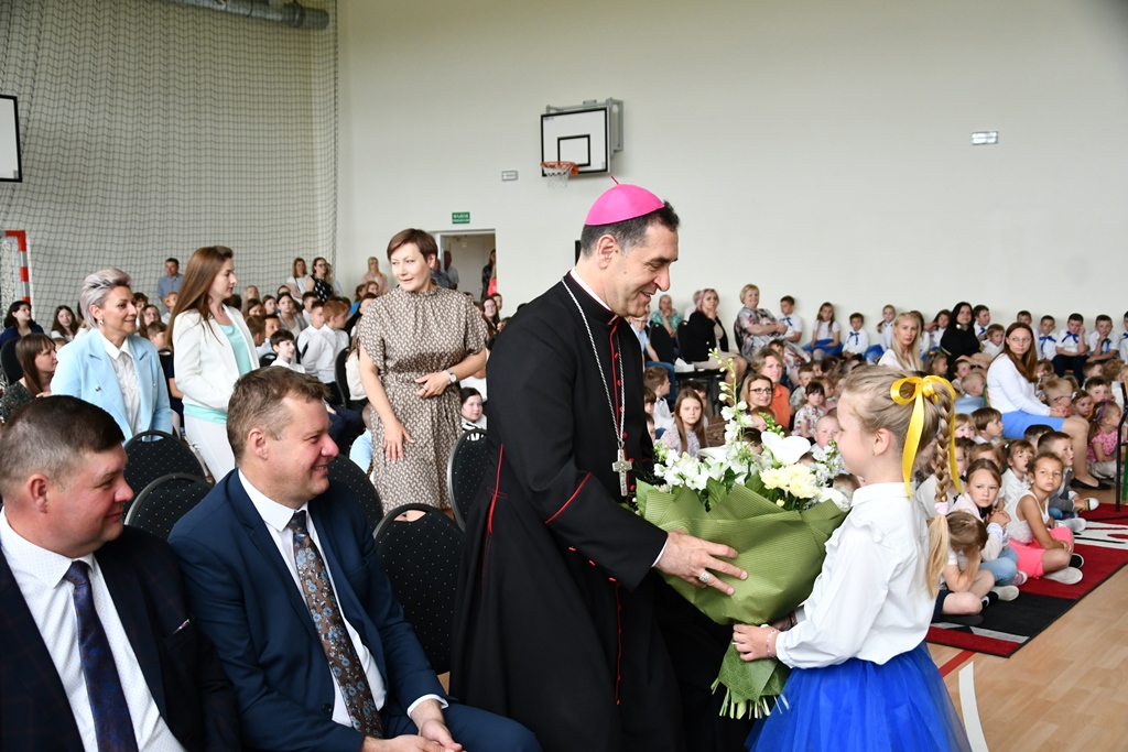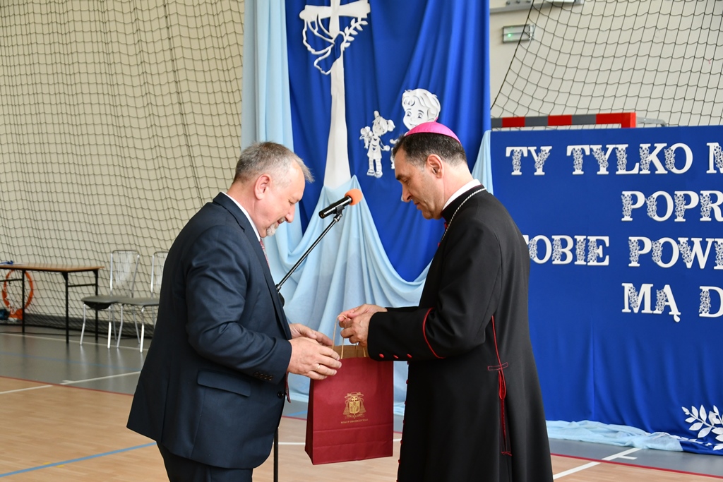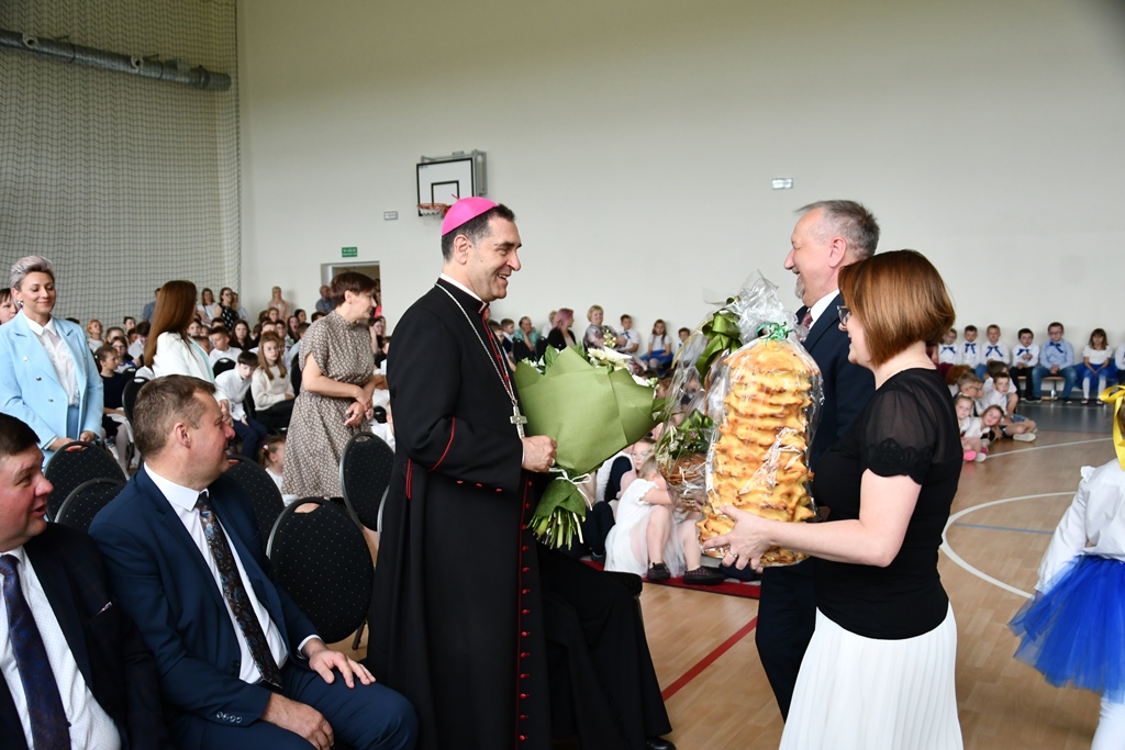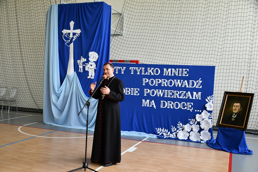 Biskupa powitał dyrektor Szkoły Andrzej Karpiesiuk. Przypomniał historię tej placówki oświatowej. Zwrócił uwagę na patrona Szkoły – ks. Franciszka Jakuba Falkowskiego. Pochodzący z pobliskiego Budlewa kapłan zasłynął jako twórca Instytutu Głuchoniemych – pierwszej w Polsce szkoły kształcącej dzieci głuche. Również dzieci i młodzież w przygotowanej części artystycznej nawiązywały do postaci wyjątkowego patrona. Nie zabrakło śpiewu z pokazywaniem oraz układów choreograficznych.