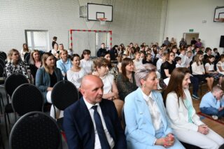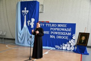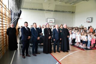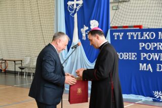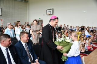 Biskup podziękował za możliwość spotkania. Pogratulował nie tylko tak zacnego Patrona Szkoły, ale również nieustannego jej rozwoju w ostatnich latach, owocującego coraz większym zainteresowaniem ze strony nowych uczniów.