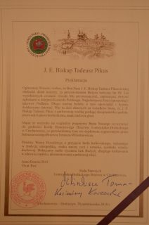Jak mówi treść proklamacji: Ogłaszamy Wszem i wobec, że Brat Nasz J.E. Biskup Tadeusz Pikus dzisiaj obchodzi dzień imienin, za przyzwoleniem Bożym kończy 69 lat wypełnionych czynami chwałę Mu przynoszącymi, zapisanymi złotymi zgłoskami w dziejach Kościoła Polskiego, Najjaśniejszej Rzeczypospolitej i takowoż Podlasia. Długo można byłoby o tym opowiadać i hymny dziękczynne śpiewać. Was tu dziś obecnych za świadków biorę, że J. E. Biskup Tadeusz Pikus z gorliwością wielką posługę duszpasterską spełnia, przewodzi ludowi drohickiemu, nauki żarliwie głosi.  Mając to wszystko na względzie  pragniemy Brata naszego wywyższyć do godności Króla Honorowego Bractwa Łomżyńsko-Drohickiego w Ciechanowcu