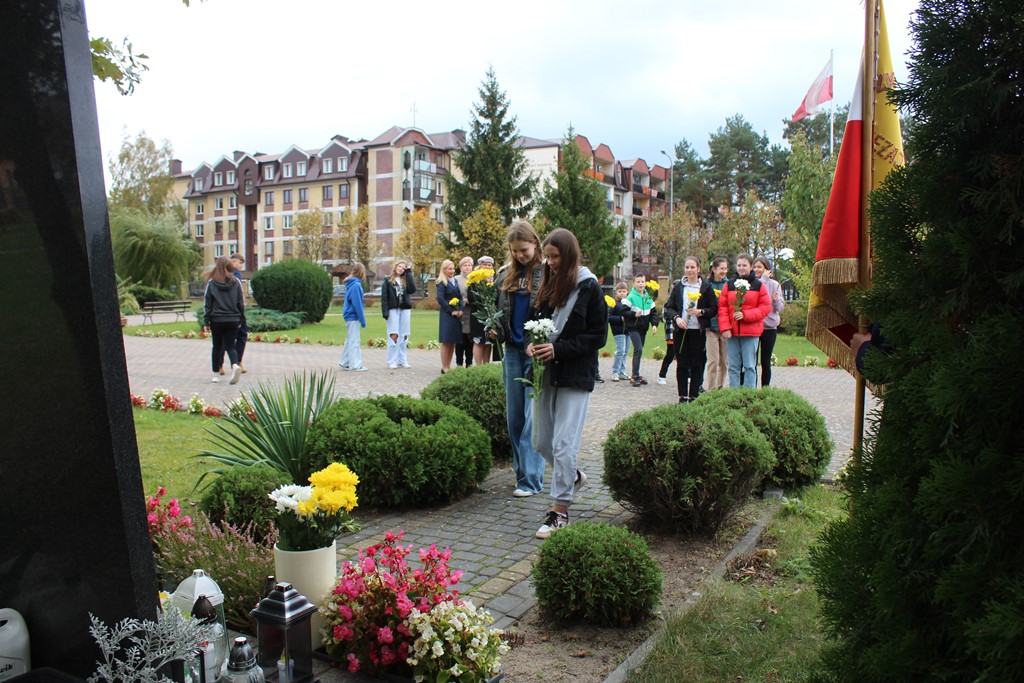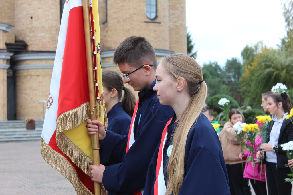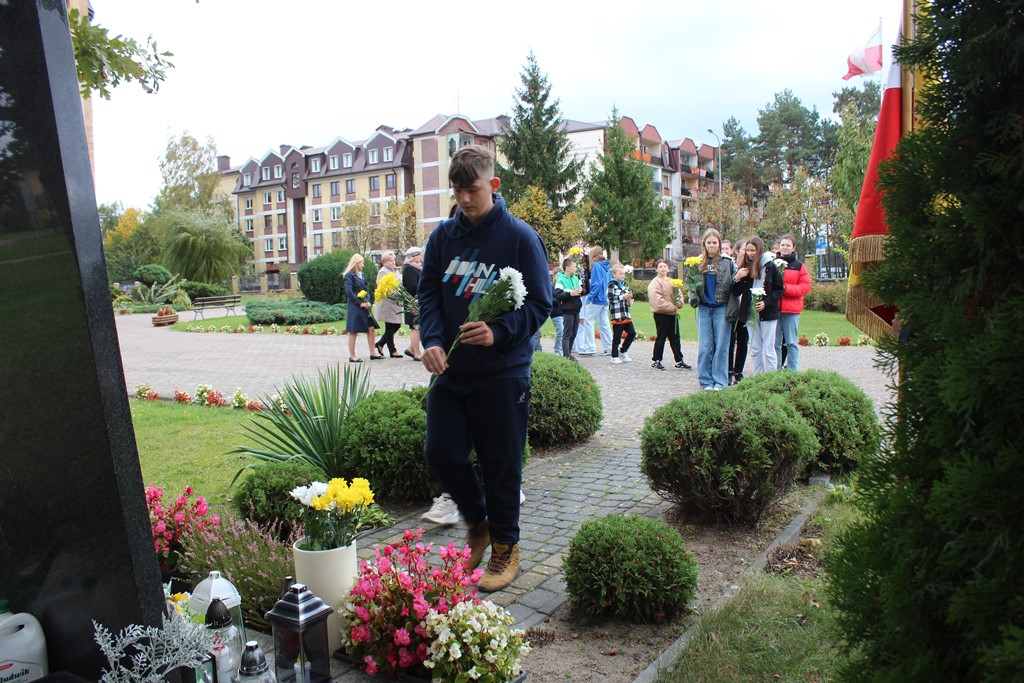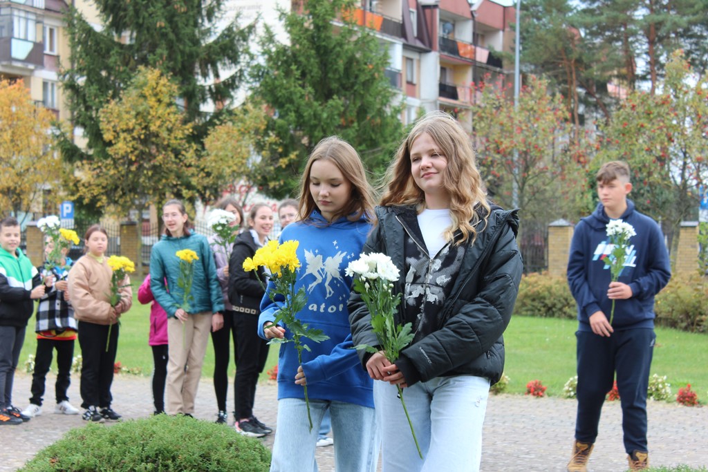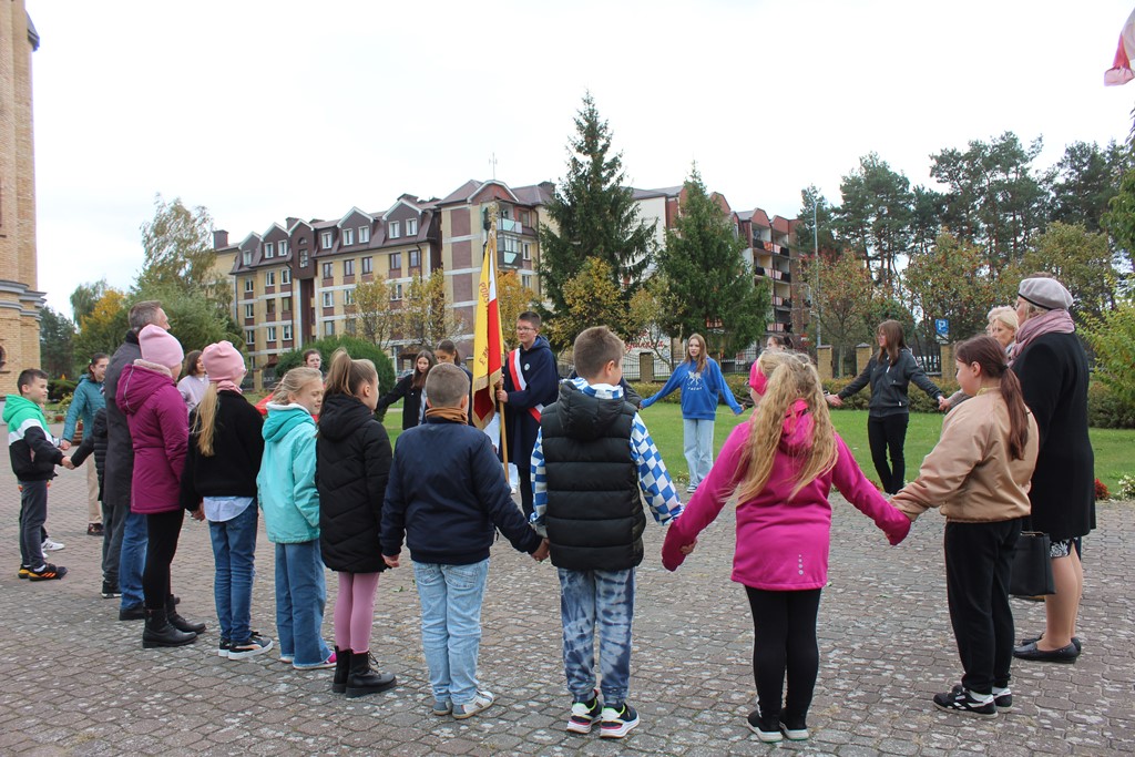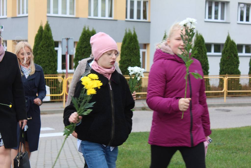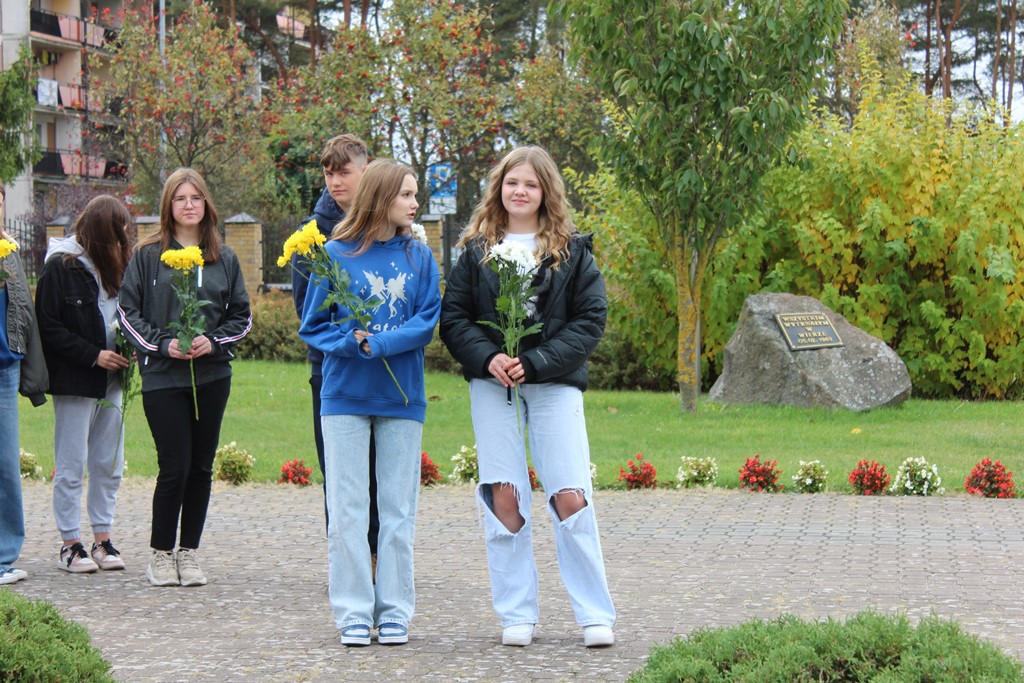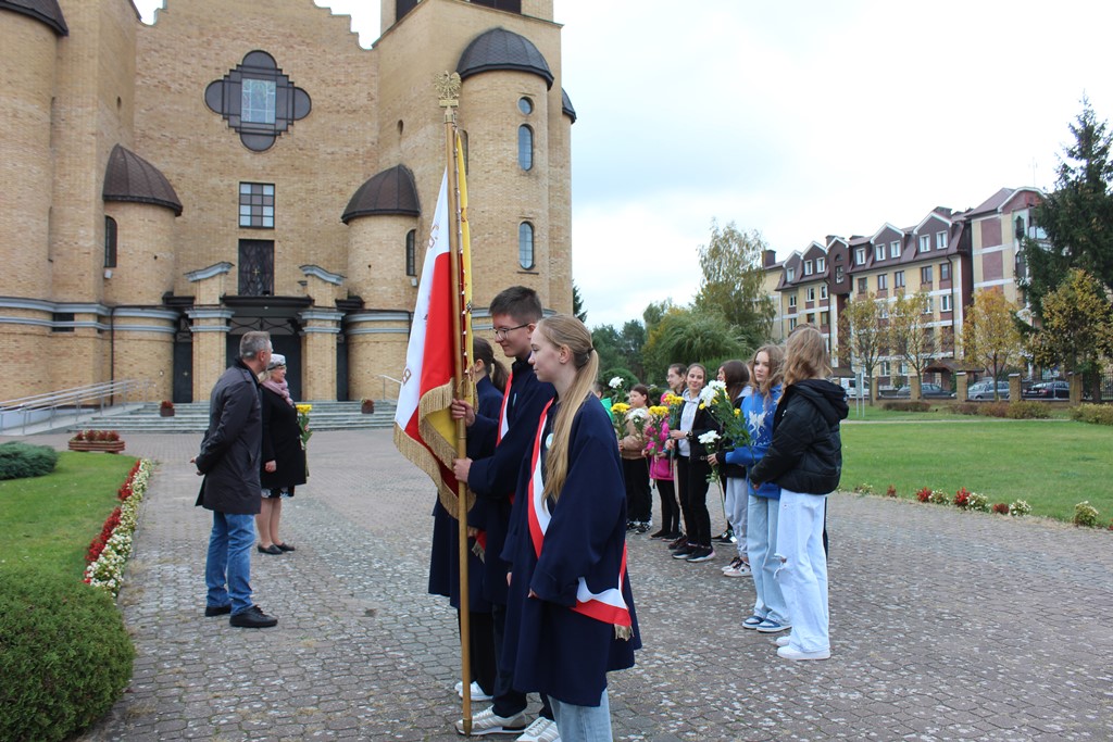 Tutaj katechetka Agnieszka Olendzka przypomniała historię Dnia Papieskiego, zaśpiewano hymn szkoły oraz „Barkę” ulubioną pieśń papieską i złożono kwiaty przy pomniku.