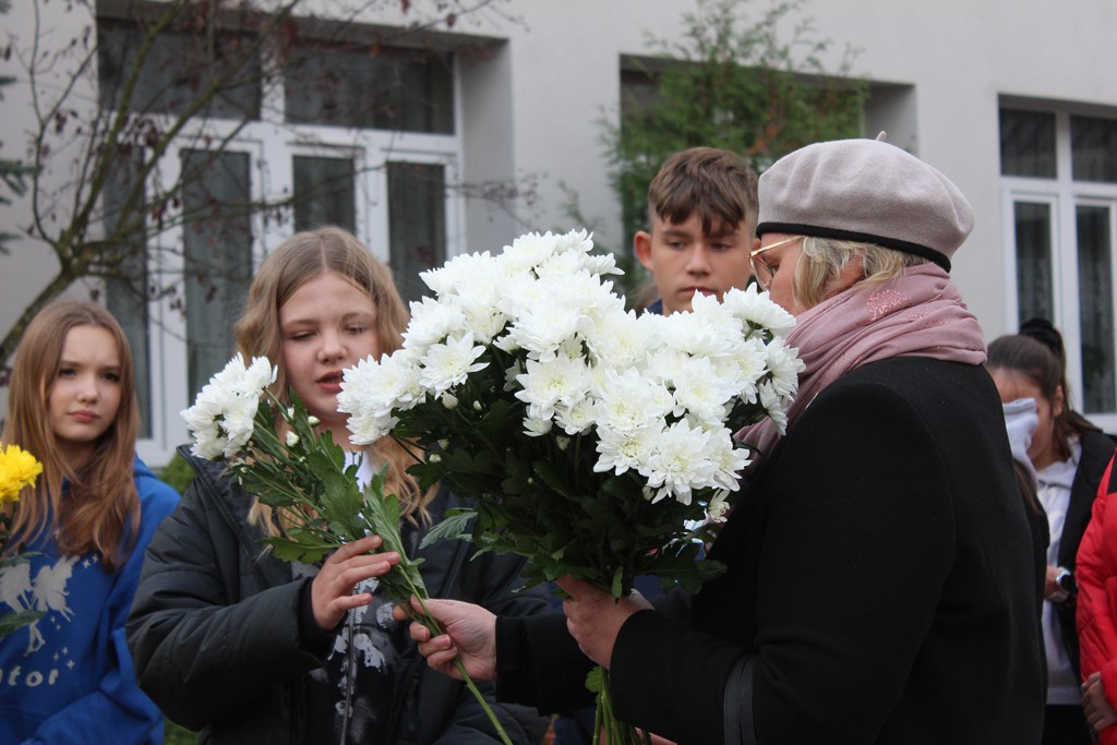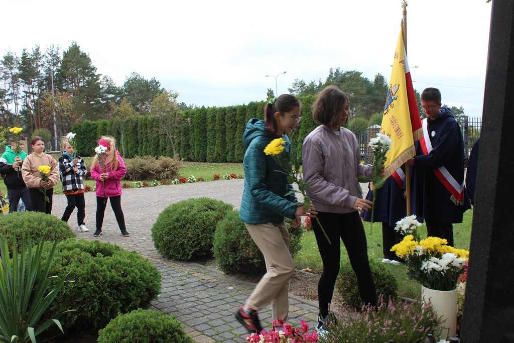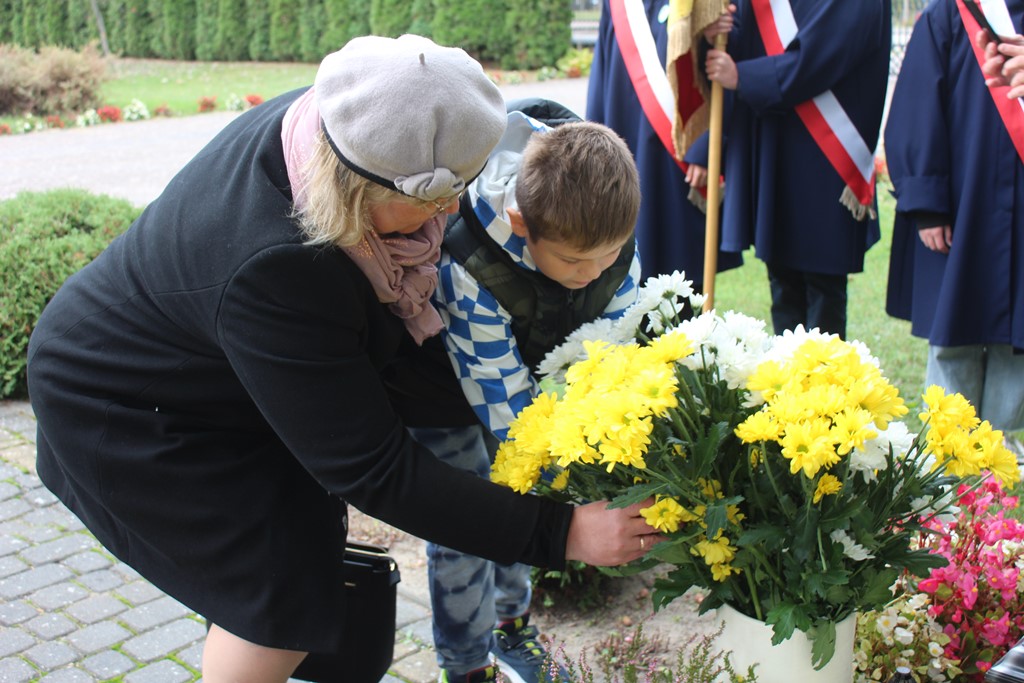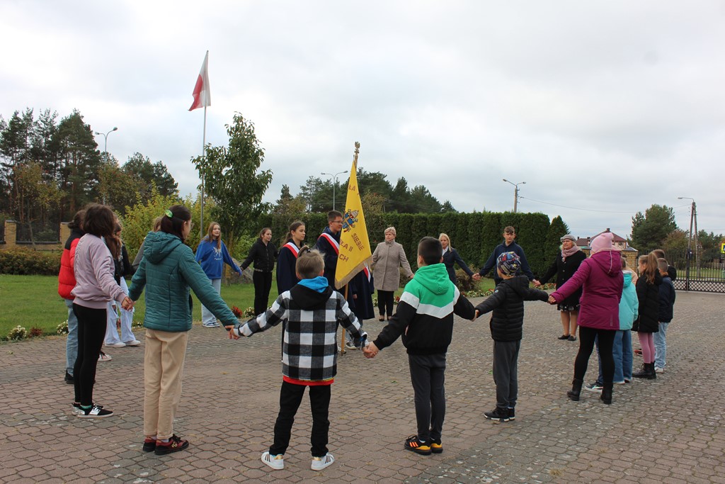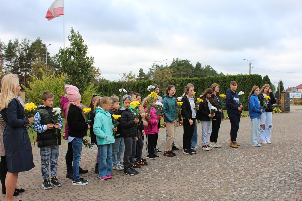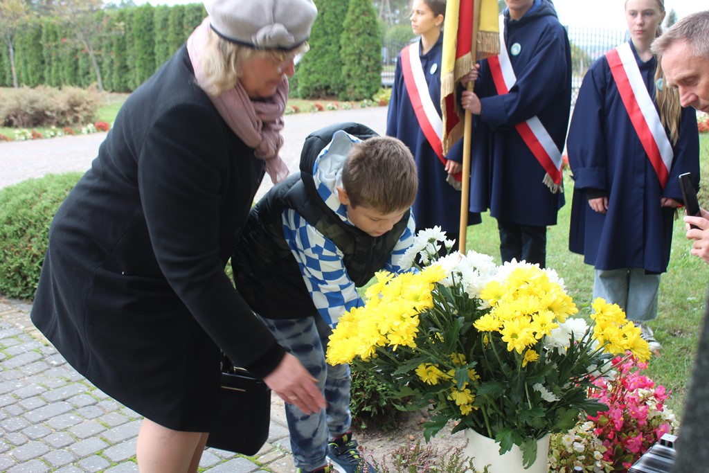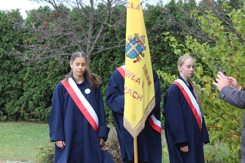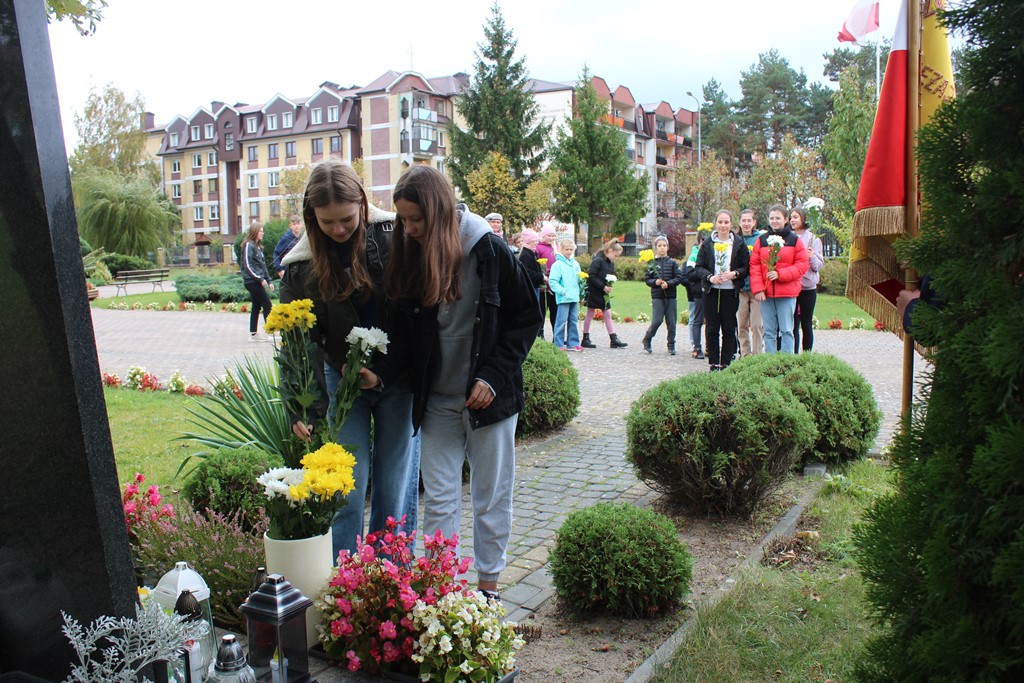 Tutaj katechetka Agnieszka Olendzka przypomniała historię Dnia Papieskiego, zaśpiewano hymn szkoły oraz „Barkę” ulubioną pieśń papieską i złożono kwiaty przy pomniku.