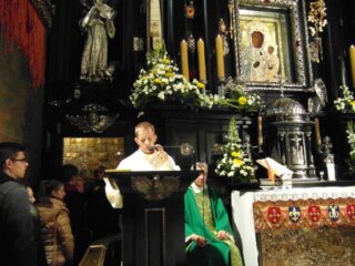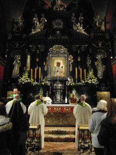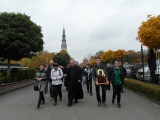 Wczesnym rankiem w niedzielę, 25 października delegacja wiernych wyruszyła do Częstochowy, by tam u stóp Jasnogórskiej Pani omodlić przygotowane do peregrynacji kopie obrazu. W grupie jadącej na Jasną Górę była młodzież przygotowująca się do przyjęcia sakramentu bierzmowania wraz z rodzicami, a także inne osoby, które chciały pokłonić się przed wizerunkiem Czarnej Madonny. Pielgrzymi bezpiecznie dotarli do Częstochowy, gdzie dorośli pierwsze swe kroki skierowali do lokalu wyborczego, by spełnić powinność wobec Ojczyzny i zagłosować w wyborach parlamentarnych. Gdy rozbrzmiewały dzwony zwiastujące Anioł Pański wierni przekroczyli bramę jasnogórską. Korzystając z czasu jaki pozostał do Eucharystii zwiedzali Sanktuarium bądź spacerowali ciesząc się obecnością w tym świętym miejscu. Znaleźli też czas na osobistą, cichą adorację Najświętszego Sakramentu. Z wielkim przejęciem zgromadzili się w kaplicy Cudownego Obrazu, gdzie uczestniczyli w specjalnie dla nich sprawowanej Mszy Świętej. Wiele osób, zwłaszcza wśród młodzieży po raz pierwszy była w Częstochowie, wszystkich jednakowo ucieszyła możliwość podejścia do samych stóp Ołtarza. Parafianie włączyli się w czytania, śpiew psalmów, modlitwę wiernych. W homilii ks. proboszcz powierzał Matce Bożej siemiatycką parafię i przypominał jej długą i nieraz bolesną historie. Zwracał uwagę na odwagę mieszkańców Siemiatycz, którzy w czasie zaborów bronili polskiej mowy. Nawiązując do zaplanowanej peregrynacji powierzał Jasnogórskiej Pani rodziny: rodziców i dzieci, dziadków i babcie. Podkreślał, jak ważna jest rodzina i pielęgnowane w niej wartości.