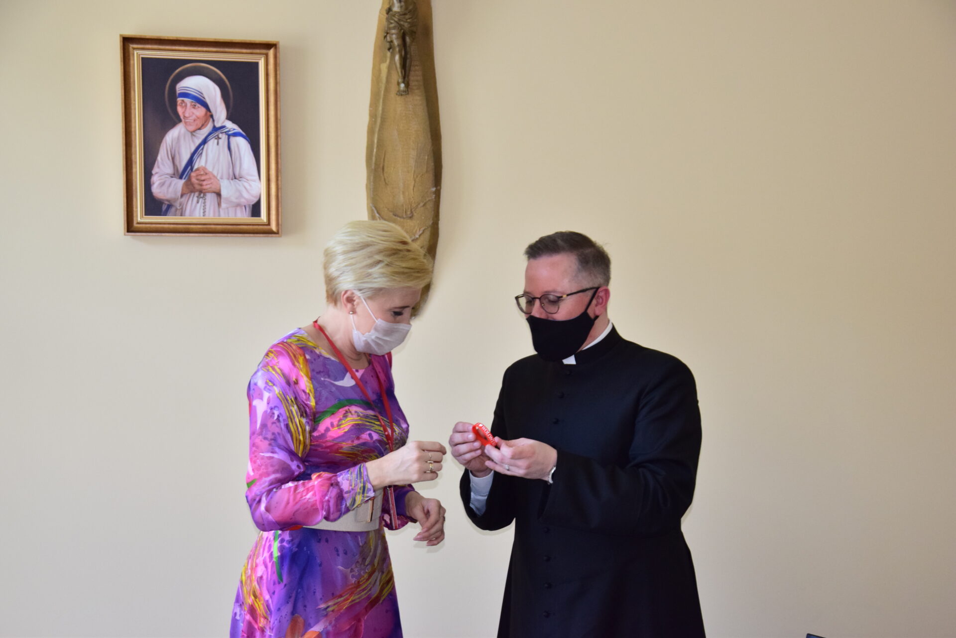 Wizyta w Jadłodajni im. Matki Teresy z Kalkuty była okazją do rozmowy na temat funkcjonowania Domu Miłosierdzia. Pierwsza Dama wyraziła radość ze spotkania w tak wyjątkowym miejscu z niezwykłymi ludźmi, którzy twórczo i bezinteresownie pomagają najbardziej potrzebującym. Z zainteresowaniem przysłuchiwała się pracownikom oraz podopiecznym, którzy dzielili się swoimi codziennymi problemami i doświadczeniami. Wybrzmiał istotny temat współpracy lokalnych samorządów z instytucjami prowadzącymi dzieła miłosierdzia oraz nadmiarem biurokracji, który utrudnia pracę na rzecz potrzebujących. Pani Prezydentowa podkreśliła jak bliski jest jej temat wolontariatu. Zachęcała do podejmowania dzieł miłosierdzia w myśl słów św. Jana Pawła II: „Człowiek jest wielki nie przez to, co posiada, lecz przez to, kim jest; nie przez to, co ma, lecz przez to, czym dzieli się z innymi”. W tym duchu ks. Łukasz Gołębiewski wręczył Pani Prezydentowej legitymację wolontariusza Caritas Diecezji Drohiczyńskiej.