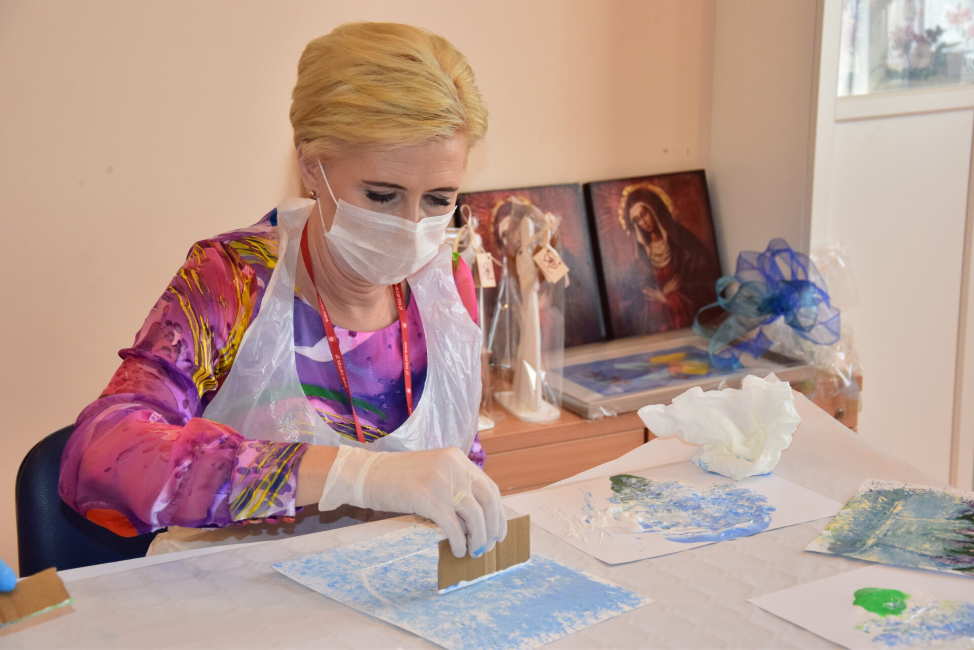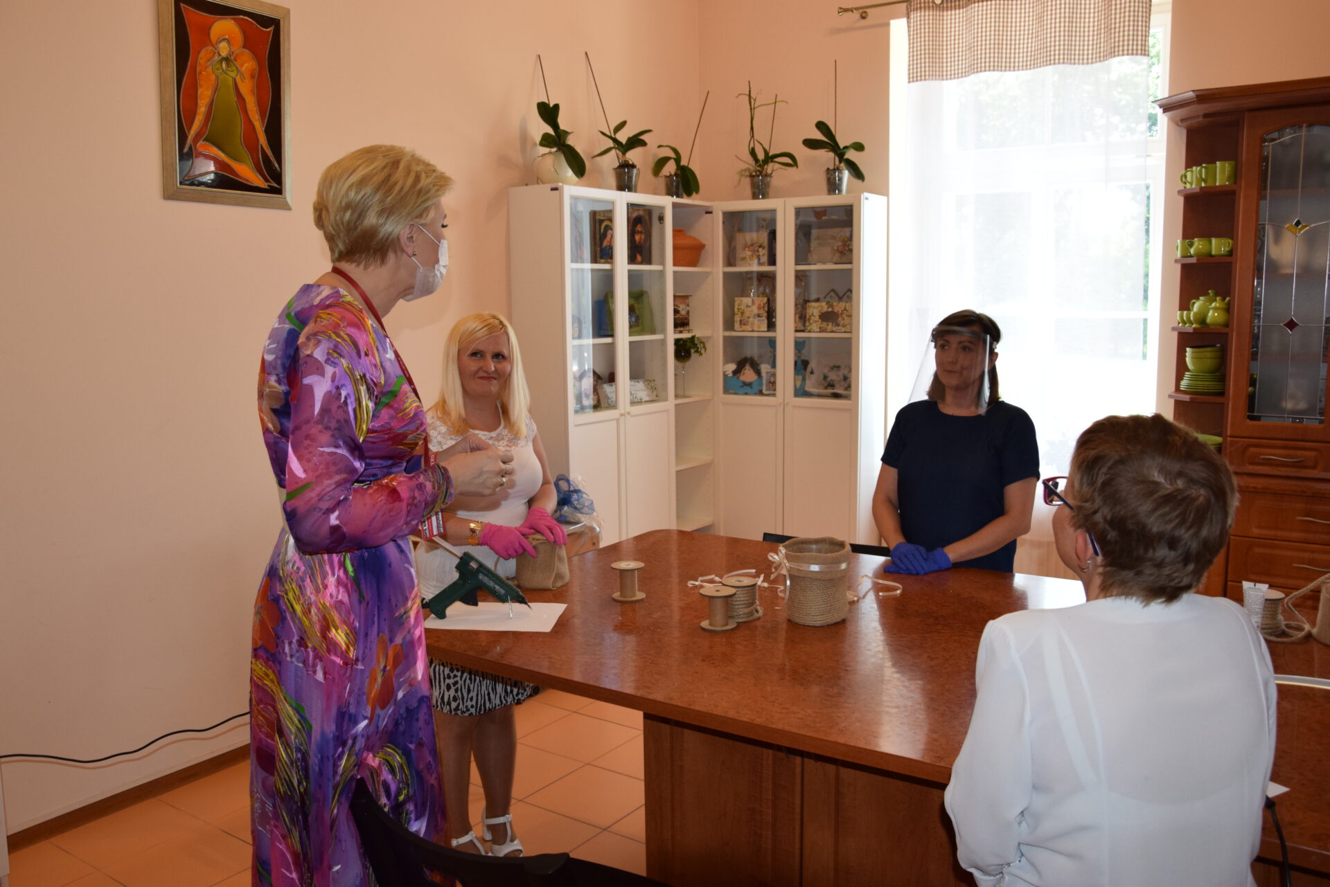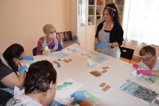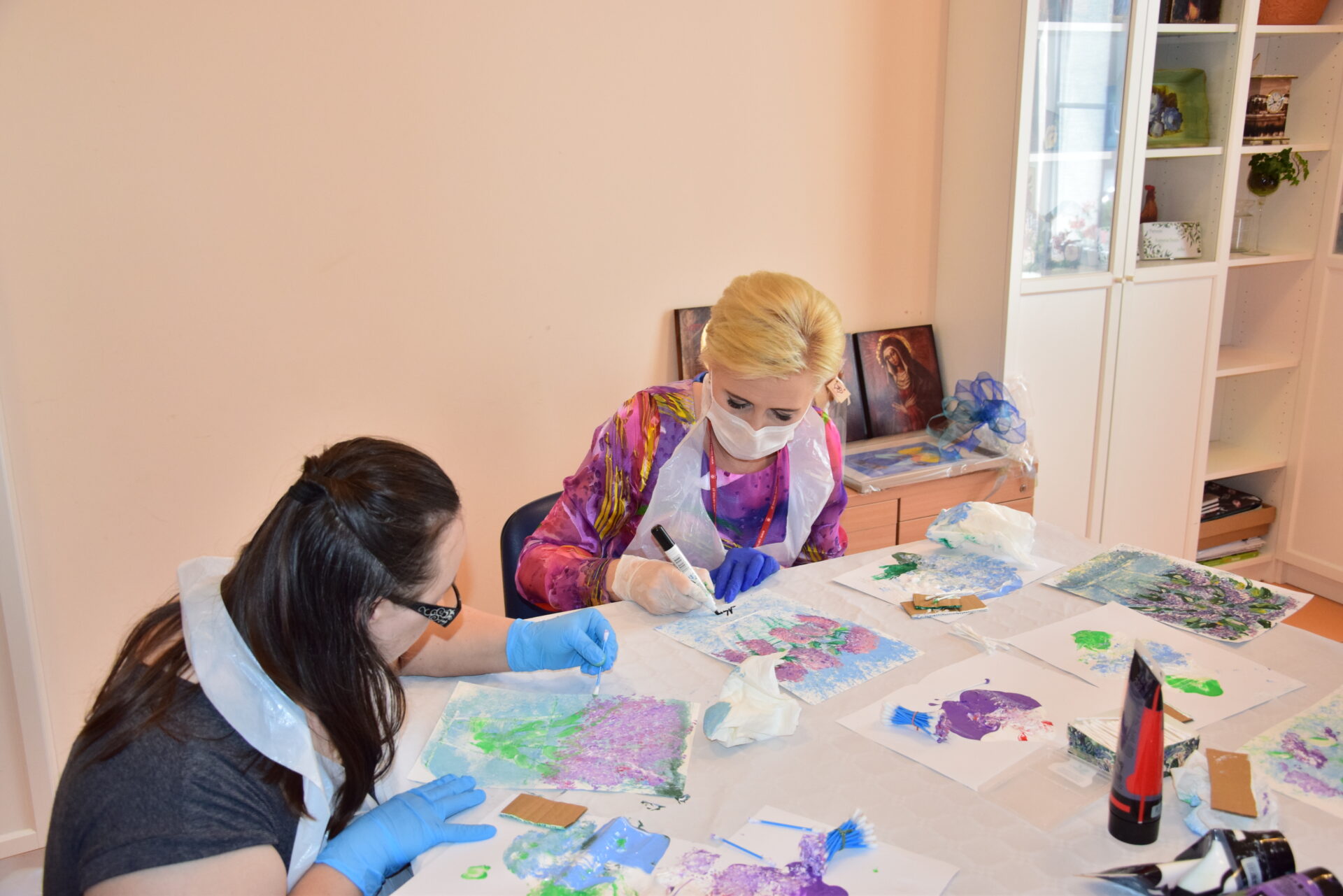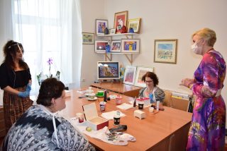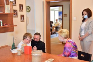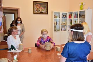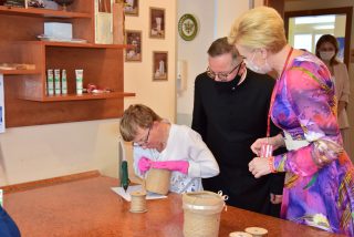 Pani Prezydentowa miała okazję odwiedzić również Warsztat Terapii Zajęciowej, a w jego ramach poszczególne pracownie: krawiecką, techniczną, florystyczną, rękodzieła artystycznego oraz multimedialną. Z żywym zainteresowaniem przyglądała się pracy podopiecznych. Aby lepiej się z nimi zapoznać i zintegrować, podjęła się wykonania pracy plastyczno-manualnej.