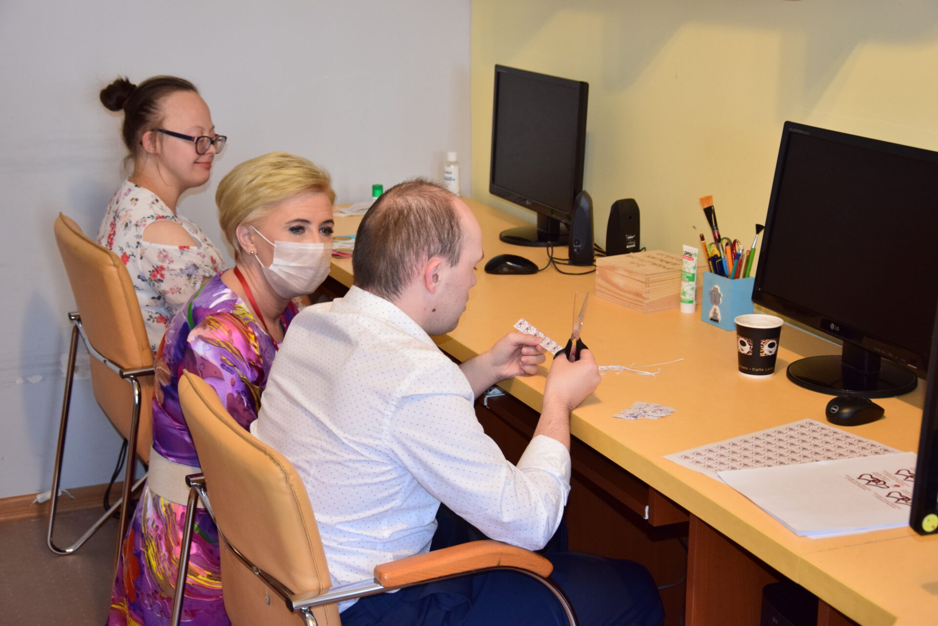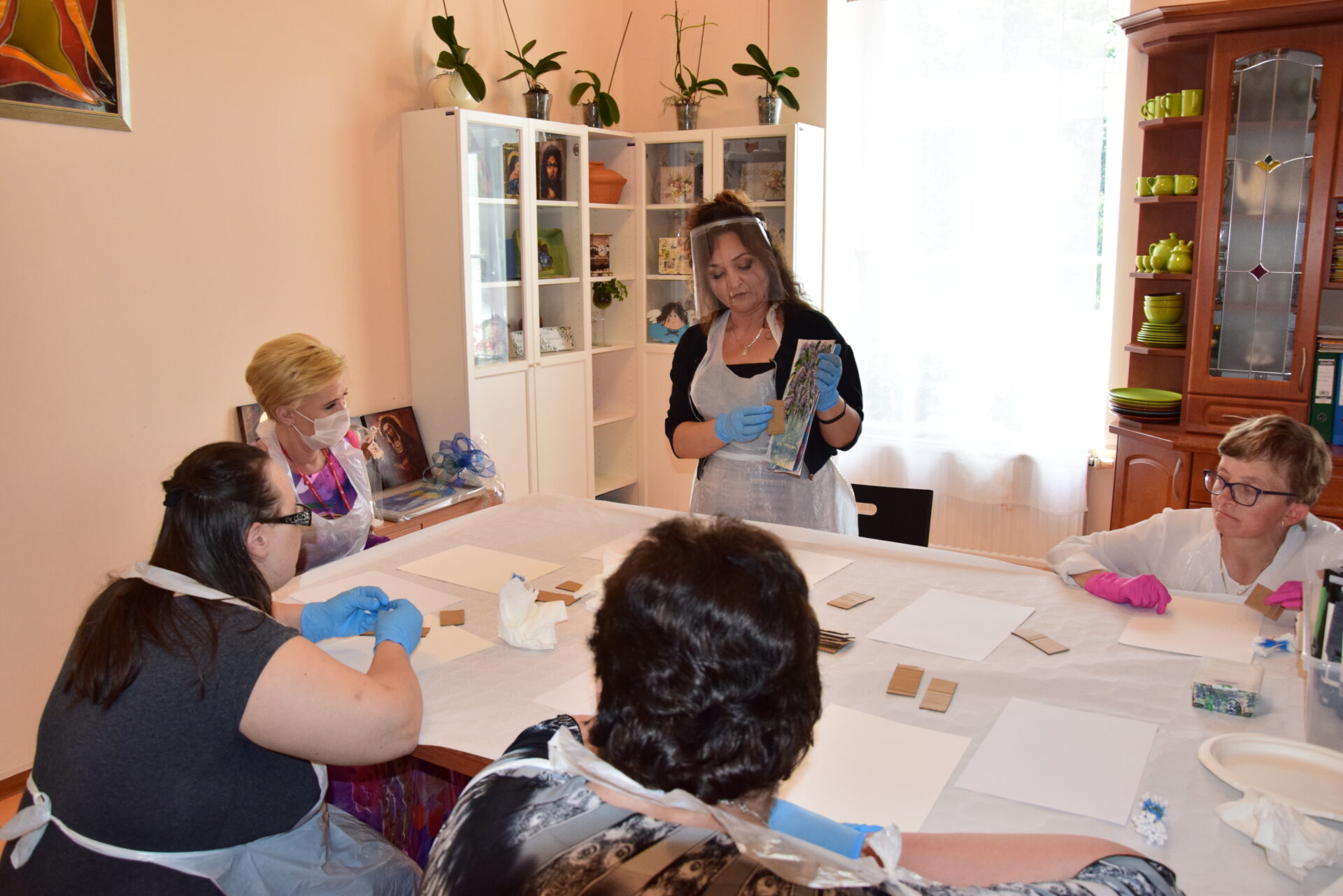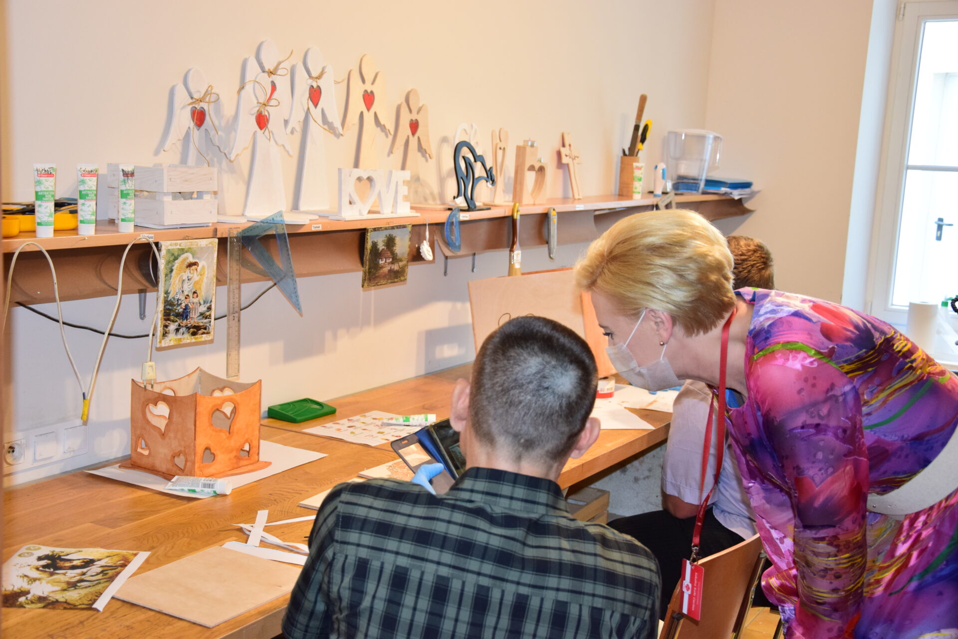 Pani Prezydentowa miała okazję odwiedzić również Warsztat Terapii Zajęciowej, a w jego ramach poszczególne pracownie: krawiecką, techniczną, florystyczną, rękodzieła artystycznego oraz multimedialną. Z żywym zainteresowaniem przyglądała się pracy podopiecznych. Aby lepiej się z nimi zapoznać i zintegrować, podjęła się wykonania pracy plastyczno-manualnej.