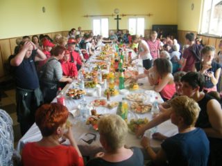 Podczas wspólnego pielgrzymowania nie zabrakło promieni słonecznych, chwil radości, uśmiechu na twarzy, śpiewu chwalącego Pana Boga, modlitwy różańcowej zanoszonej przez wstawiennictwo Matki Bożej, wzajemnej życzliwości oraz konferencji przybliżającej nam historię Sanktuarium. W połowie naszej wędrówki zostaliśmy ciepło przywitani i ugoszczeni poczęstunkiem przez mieszkańców Toczysk i Dzierzb w remizie strażackiej. Po przerwie, wzmocnieni na ciele i napełnieni nowymi siłami wyruszyliśmy na ostatnie kilometry naszej drogi pielgrzymkowej. Dotarliśmy wszyscy do celu i pomodliliśmy się pozdrawiając Jezusa Chrystusa. Po czym każdy miał czas, by przygotować się do uczestnictwa w Eucharystii, która rozpoczęła się o godz. 16.30.