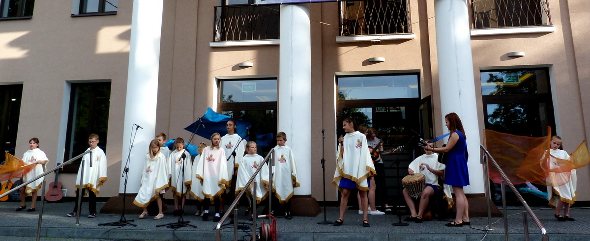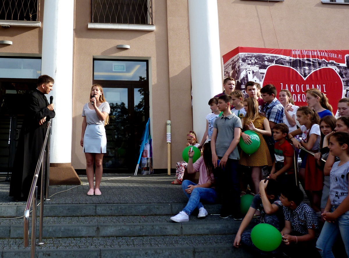 Ostatnia część tegorocznego marszu miała miejsce przed Sokołowskim Ośrodkiem Kultury. Tam młodzi wykonawcy z PDK w Zembrowie zaprezentowali godzinny program artystyczny: układy taneczne w wykonaniu trzech grup wiekowych, recytacje i pieśni religijne w wykonaniu scholi „Boże Promyki” i solistów. Licznie zebrani uczestnicy marszu, a także przypadkowi widzowie szczególnie dużymi  brawami nagrodzili  Kubę Jurczaka, ucznia kl. IV Szkoły Podstawowej w Zembrowie, który pięknie zaśpiewał pieśń „Tłumy serc” oraz najmłodszych tancerzy  – przedszkolaków. W duecie z ks. Piotrem pięknie zaśpiewała też Karina, która wraz z młodzieżą z Emilczyna na Ukrainie przebywała w Sokołowie na koloniach. Ważną częścią spotkania przed SOK  były  świadectwa: Agnieszki i Janusza z Siemiatycz – rodziców Łucji, Klary, Miriam i Jana Pawła, Agnieszki i Grzegorza ze Wspólnoty Domowego Kościoła w Sokołowie Podlaskim oraz Alicji ze Wspólnoty Trudnych Małżeństw Sychar. Wszyscy podkreślali, jak ważne jest zawierzenie Bogu.