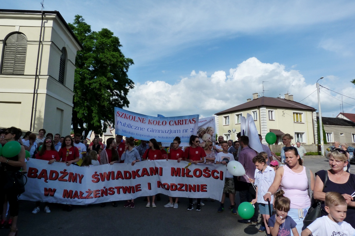 Kilkuset uczestników marszu wyruszyło sprzed konkatedry  po uroczystej Mszy św. o godz. 16:00  sprawowanej  w intencji świętości życia i  rodzin. Trasa przebiegała  głównymi ulicami miasta w stronę Sokołowskiego Ośrodka Kultury. W trakcie ok. dwukilometrowej wędrówki o radosną modlitewną atmosferę zadbał ks. Arbaszewski, śpiewy przygotowali uczestnicy zajęć w Parafialnym Domu Kultury w Zembrowie pod kierunkiem instruktorki Marty Wróbel.