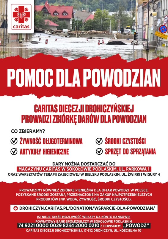 Caritas Diecezji Drohiczyńskiej prowadzi zbiórkę darów dla powodzian.