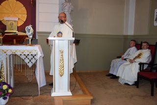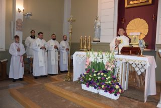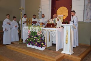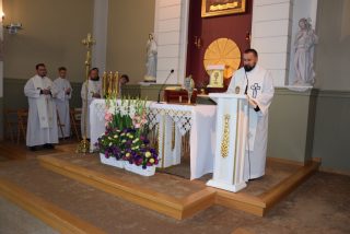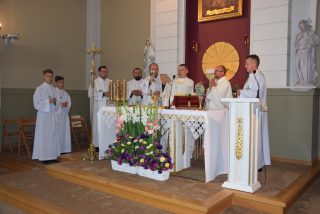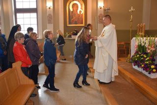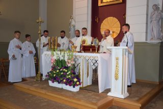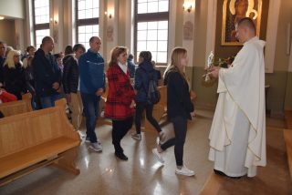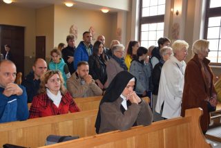 Mszy św. koncelebrowanej przewodniczył ks. Andrzej Falkowski – miejscowy proboszcz i Kierownik Pielgrzymki. Słowo Boże wygłosił ks. Andrzej Witerski, który w parafii prowadził Czterdziestogodzinne Nabożeństwo Eucharystyczne przed wspomnieniem św. Ojca Pio. W homilii zwrócił uwagę na świadome uczestnictwo we Mszy św, i właściwe do niej się przygotowanie na wzór św. Ojca Pio. Podkreślił, że każda Msza św. jest momentem kiedy Bogu składamy dzięki oraz prosimy o potrzebne łaski. Na zwór osób z Ewangelii, które przyniosły do Jezusa sparaliżowanego człowieka, na Eucharystię przynosimy przed oblicze Pana te osoby, które z różnych przyczyn nie potrafią same przyjść od Boga.