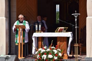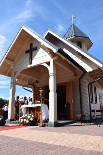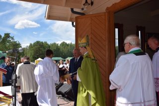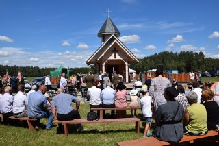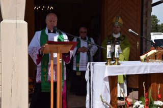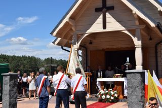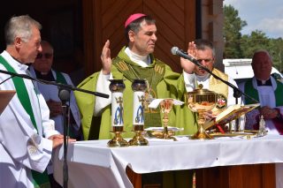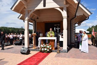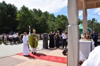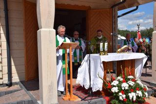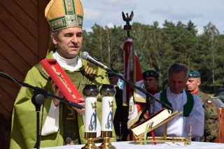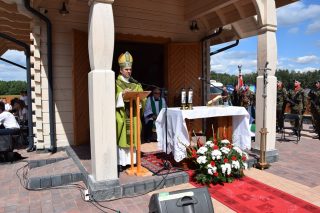 Po rozpoczęciu Eucharystii ks. Biskup uroczyście poświęcił kaplicę. W swojej homilii przypomniał, czym jest faktycznie „Miejsce Święte”. Jest takie, „bo czuje się tu jakby bardziej intensywną obecność Pana Boga – Tego, od Którego wszystko się zaczęło i Który jest wszędzie i ku Któremu wszystko zmierza”. Jako miejsce szczególnej obecności Boga zostało ono naznaczone cudowną obecnością Maryi, która według przekazów miała się objawić jednemu z mieszkańców i pozostawić odcisk stopy na jednym z kamieni oraz cudowne źródełko, którego woda ma właściwości uzdrawiające. „Ogarnia nas niemałe zdziwienie, że w dniu obranym na dzień pobłogosławienia kaplicy, rozbrzmiewają następujące słowa I czytania: Wszyscy spragnieni, przyjdźcie do wody, przyjdźcie, choć nie macie pieniędzy!. Nie jest to fragment Pisma Świętego specjalnie dobrany, ale przewidziany na dzisiejszą niedzielę i odczytywany w każdym kościele. Myślę jednak, że nie wszędzie brzmią one tak, jak tu. (…) przyjdźcie po to, czego nie kupuje się za pieniądze, co nie ma swojej wymiennej ceny, co jest bezcenne” – powiedział ks. Biskup. Nawiązując do okoliczności powstania tej kaplicy jako wotum Bogu za cudowne działanie Boga, Ekscelencja przypomniał zgromadzonym, że każdy człowiek potrzebuje Bożej interwencji i Jego miłości, szczególnie kiedy doznaje ciężkich doświadczeń i trudności. Ufność w Bożą pomoc była obecna w sercach walczących podczas Bitwy Warszawskiej i jest obecna dzisiaj w sercach tak wielu Polaków. Nawiązując do słów Fiodora Dostojewskiego ks. Biskup stwierdził, że „Boga potrzebuje każdy i katorżnik i wolny, ale niewątpliwie katorżnik bardziej tę potrzebę odczuwa”. Przypomniał również, że ta kaplica jest przede wszystkim po to, aby w ciszy i skupieniu każdy wierzący mógł zwrócić się do Boga i powierzyć Mu swoje życie za przyczyną Niebieskiej Matki.