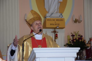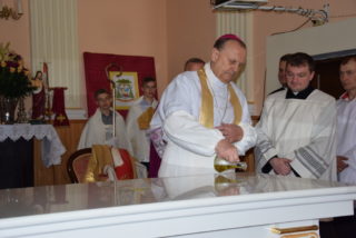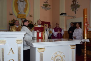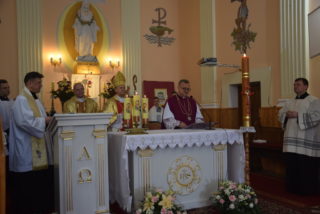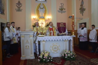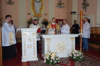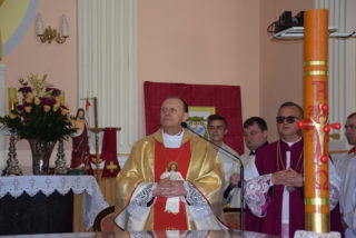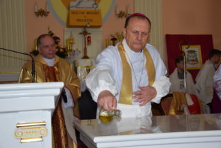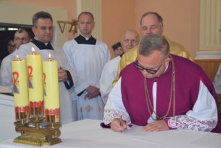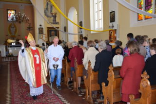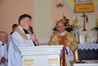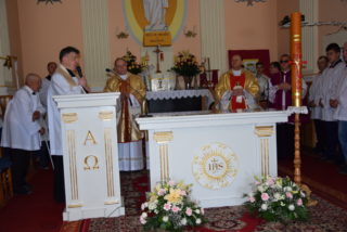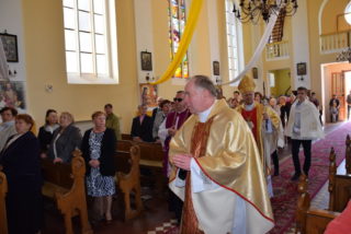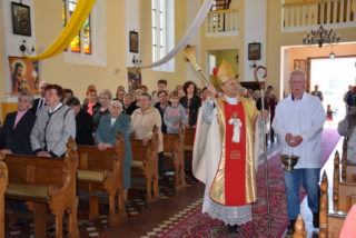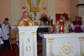 W homilii ks. Biskup nawiązał do pytania króla Salomona – budowniczego świątyni jerozolimskiej, czy Bóg może zamieszkać w domu zbudowanym ludzką ręką? Jak zauważył, w Starym Testamencie, jednym ze znaków Bożej obecności w świątyni były przechowywane tablice z dziesięcioma przykazaniami. Określają one właściwy stosunek do Boga i do drugiego człowieka. Sytuacja zmieniła się w momencie, gdy Bóg stał się człowiekiem. Przez fakt wcielenia, człowieczeństwo stało się świątynią Boga. Wprawdzie Bóg mieszka w sercu człowieka, potrzeba jednak zewnętrznego znaku, jakim jest budynek kościoła. Tu gromadzą się wierni, by oddawać cześć Bogu, słuchać Jego słowa, otrzymywać łaski w sakramentalnych znakach. Najważniejszą czynnością jest sprawowanie Eucharystii – powiedział Ekscelencja. Ks. Biskup przypomniał również historię parafii oraz kościoła.