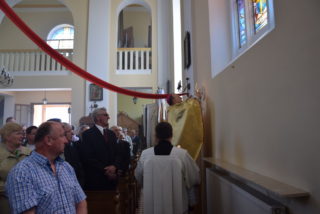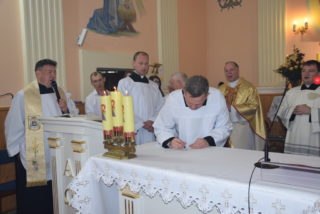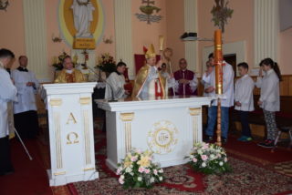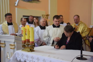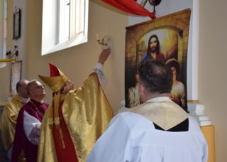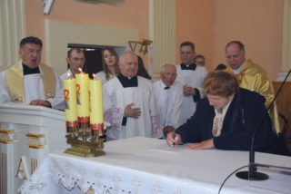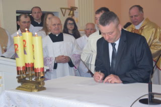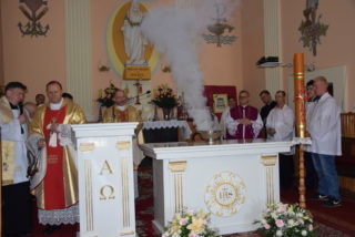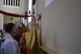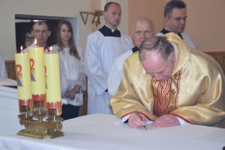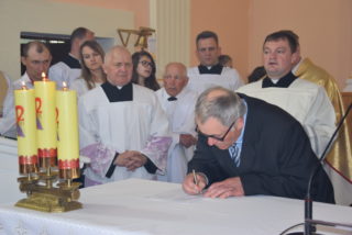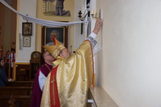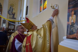 Po blisko dziewięćdziesięciu latach od wybudowania świątyni, miała miejsce uroczystość jej poświecenia. Podczas Mszy św. ks. Biskup dokonał niezwykle wymownych obrzędów, czyniących budynek domem Bożym: odmówił stosowne modlitwy, pokropił ściany i ołtarz wodą święconą, namaścił mensę ołtarza oraz ściany olejem krzyżma, okadził ołtarz. W miejscu namaszczenia ścian zapłonęły specjalne świece zwane zacheuszkami. Podczas modlitwy przyzywano wstawiennictwa świętych, śpiewając Litanię do Wszystkich Świętych.