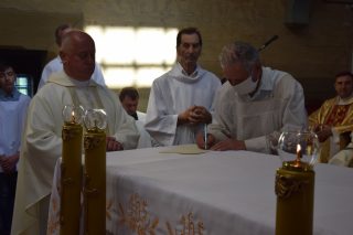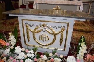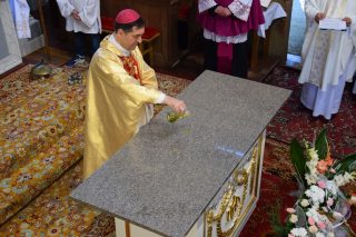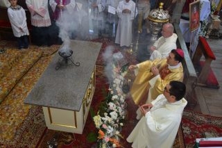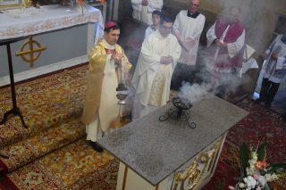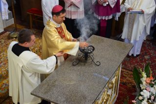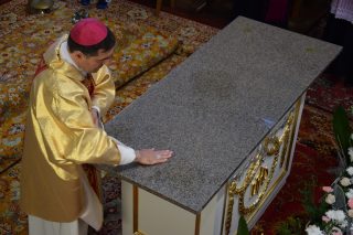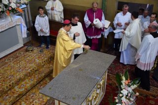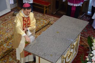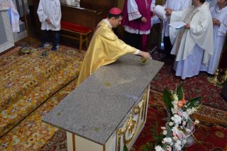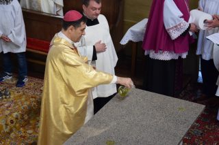 Po wyznaniu wiary i odśpiewaniu Litanii do Wszystkich Świętych dokonał się akt poświęcenia ołtarza. Ks. Biskup odmówił modlitwę poświęcenia, a następnie w pięciu miejscach mensy ołtarza roztarł Olej Krzyżma. Wymownym momentem było ustawienie na ołtarzu naczynia z żarzącymi węglami, które ks. Biskup posypał kadzidłem. Akt ten oznacza pragnienie Ludu Bożego, oddawanie na tym miejscu czci i chwały Bożej.