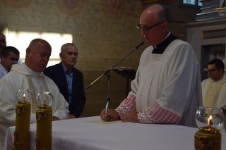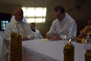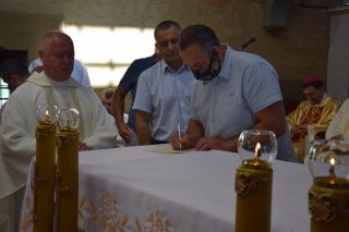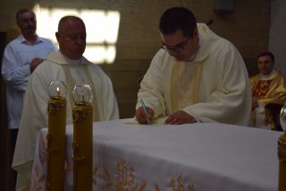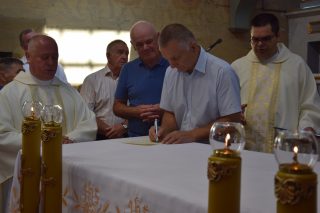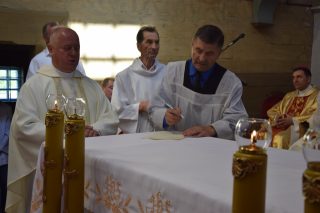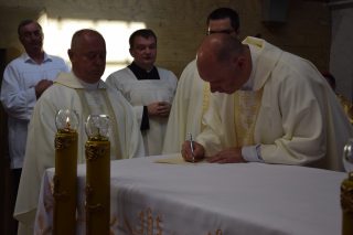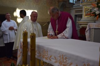 Po Komunii Świętej ks. Kanclerz odczytał dekret poświęcenia ołtarza, który podpisali: ks. Biskup, zebrani kapłani oraz członkowie rady parafialnej.